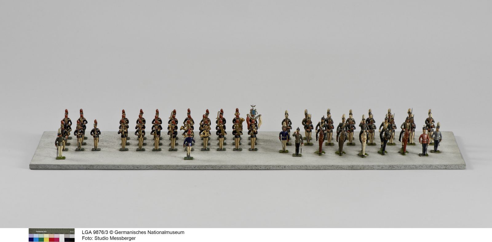 Zinnfiguren, mit Ölfarbe gefasst, auf Holzplatte montiert;