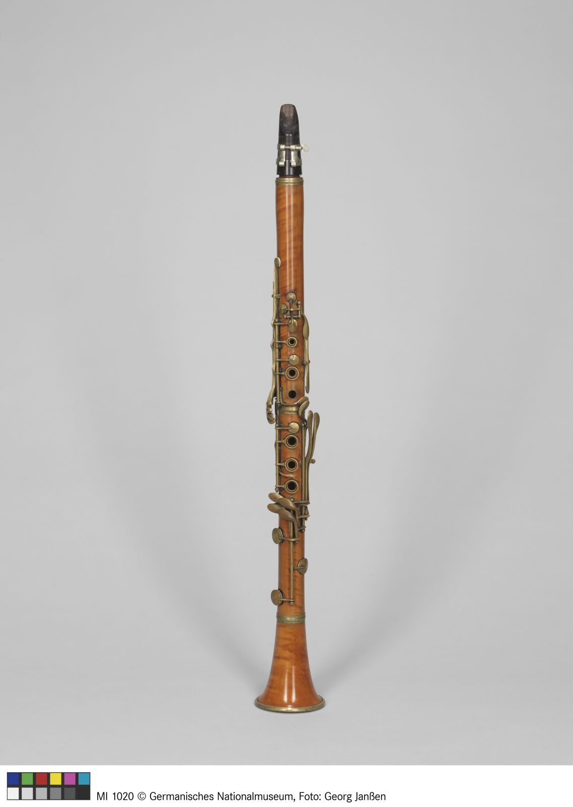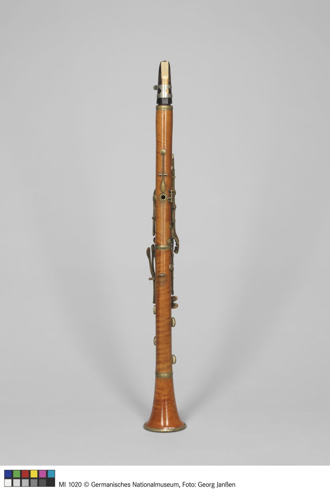 Korpus geflammter Buchsbaum; Klappen, Zwingen, Daumenstütze Messing; Schnabel dunkles, exotisches Hartholz; Blattschraube und Schnabelhülse Weißblech (?)