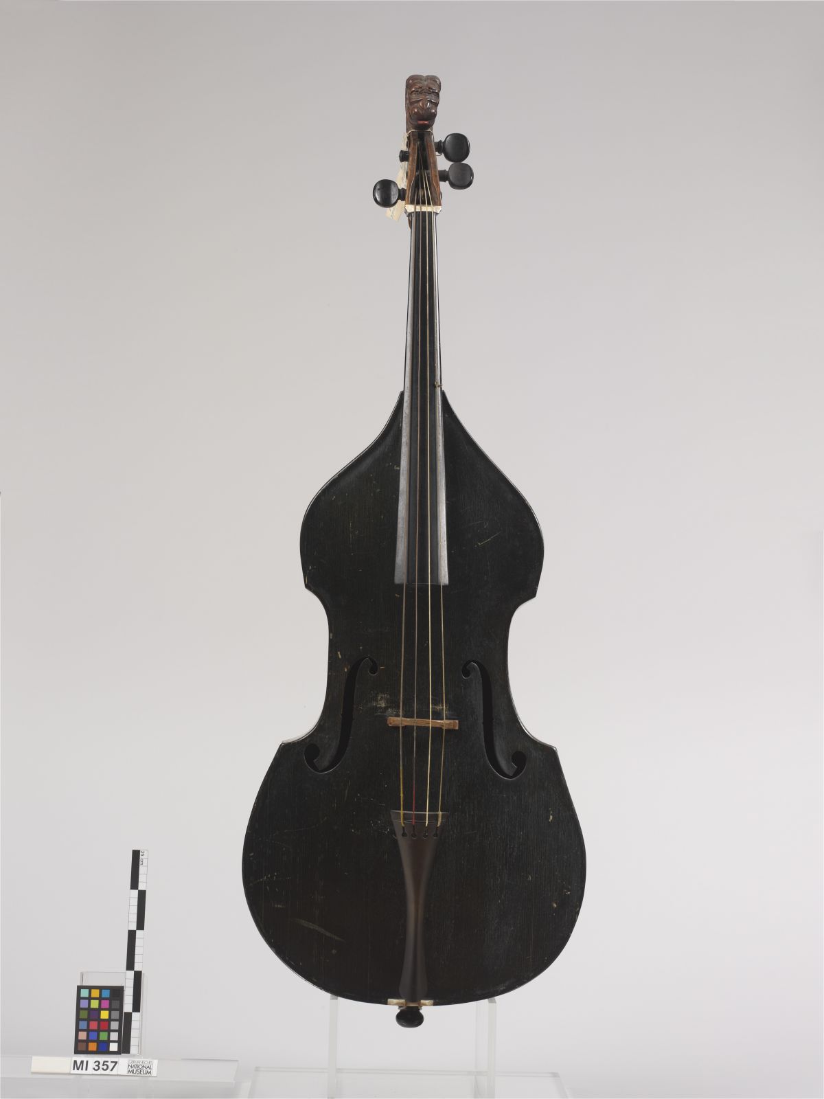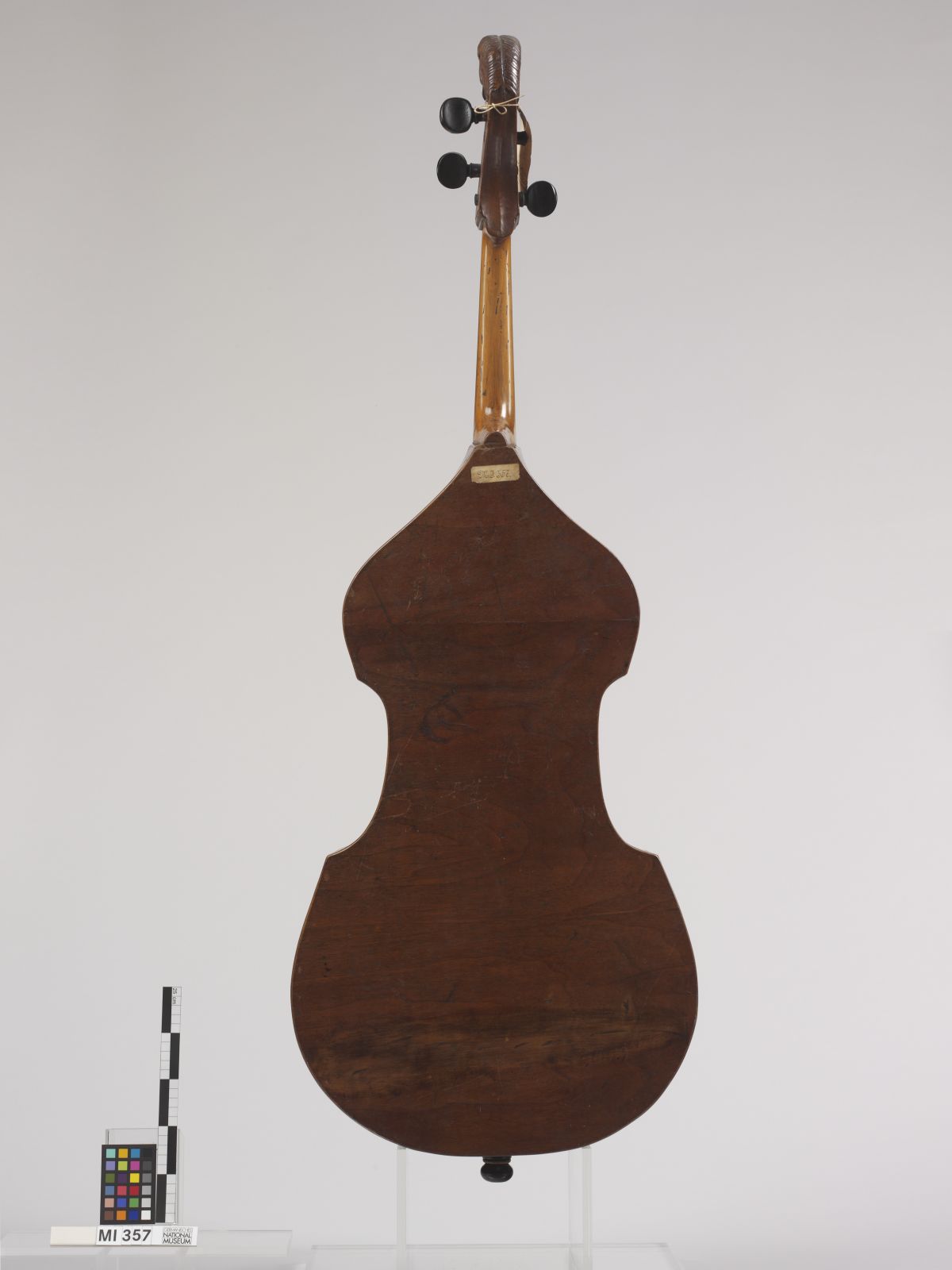 Decke Nadelholz; Boden und Zargen Nussbaum zweischichtig; Hals, Wirbelkasten und Kopf Ahorn; Griffbrett (modern) Ebenholz.