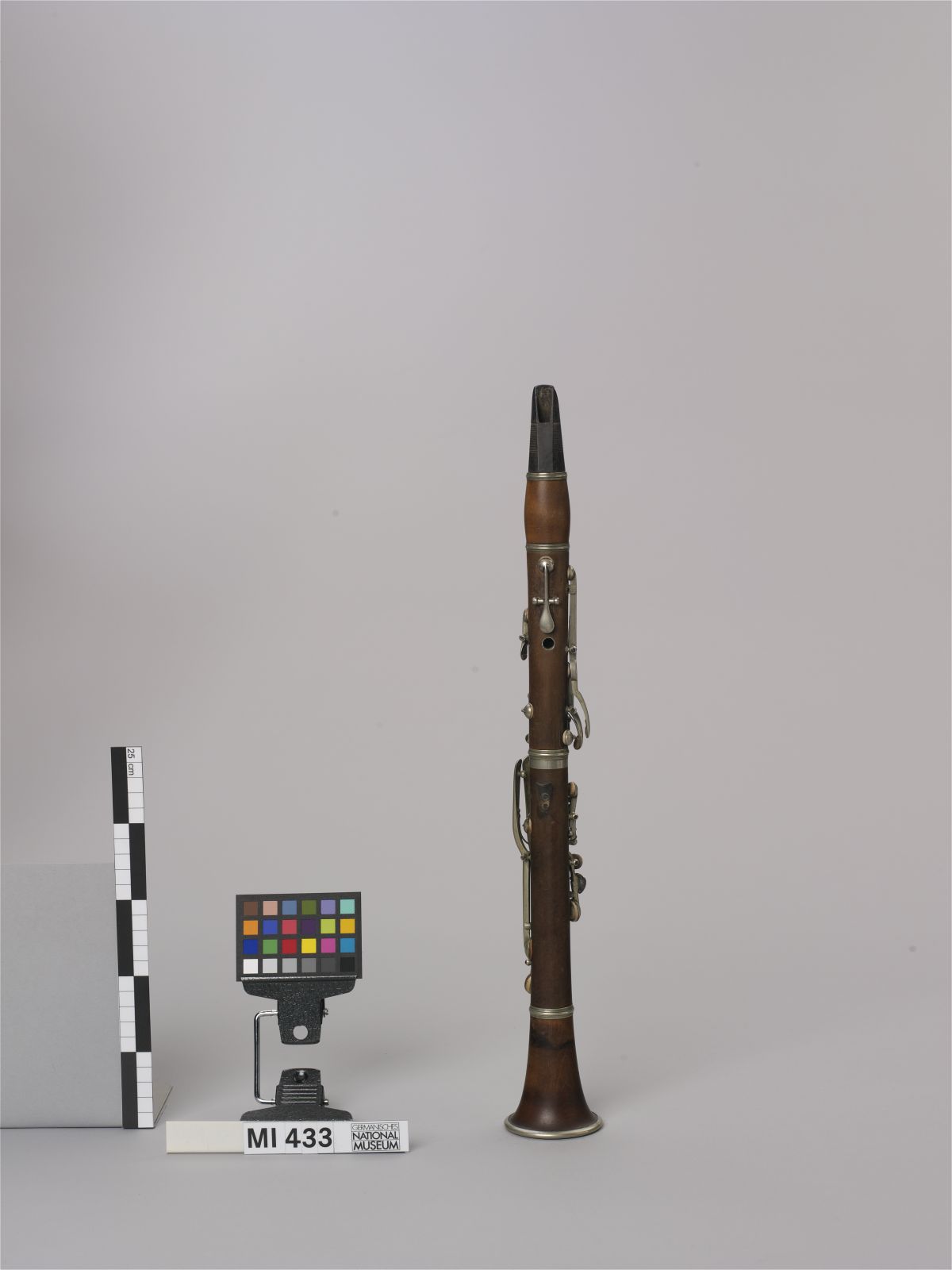 Schnabel: dunkles exotisches Hartholz; Korpus: Obstholz oder Buchsbaum, gebeizt, mit Resten schwarzer Fassung; Zwingen: Neusilber; Klappen: Neusilber