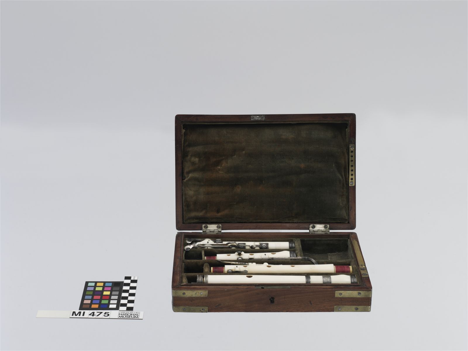 Korpus: Elfenbein; Kappe: Elfenbein und Silber; Zwingen und Klappen: Silber; Klappenpolster: Zinn