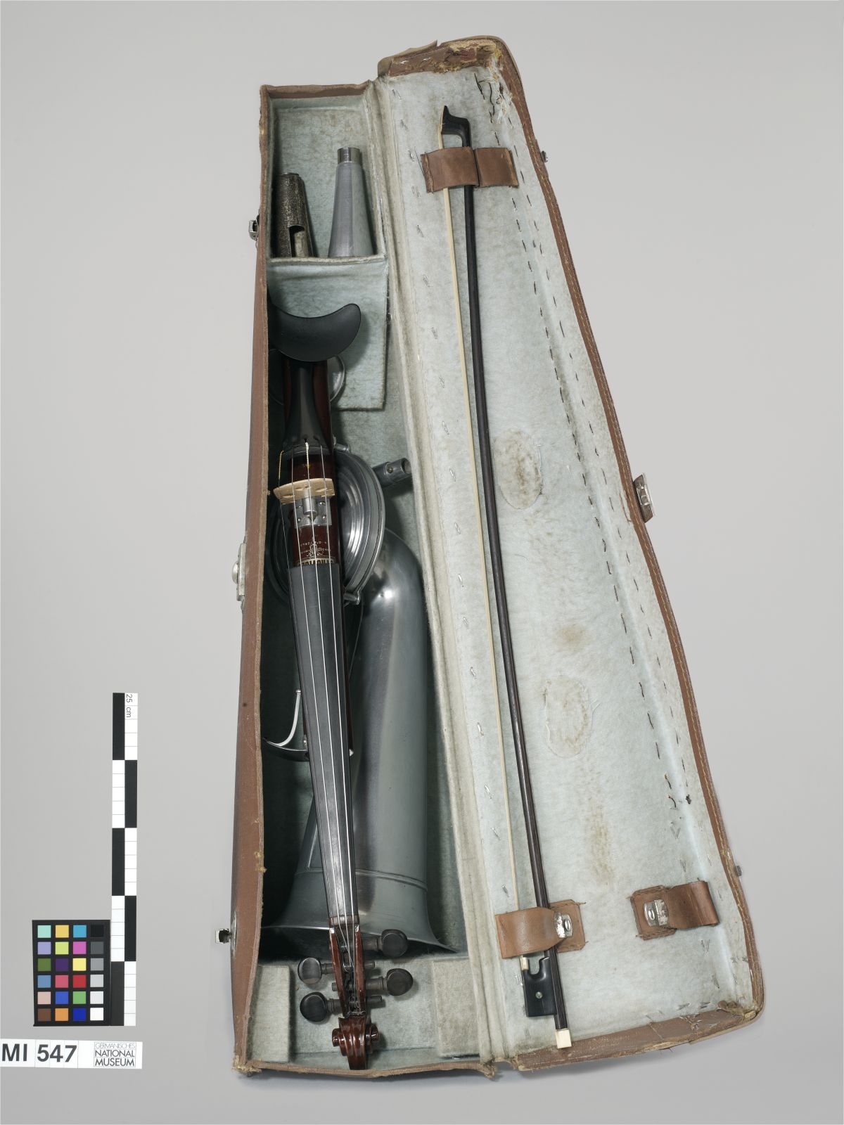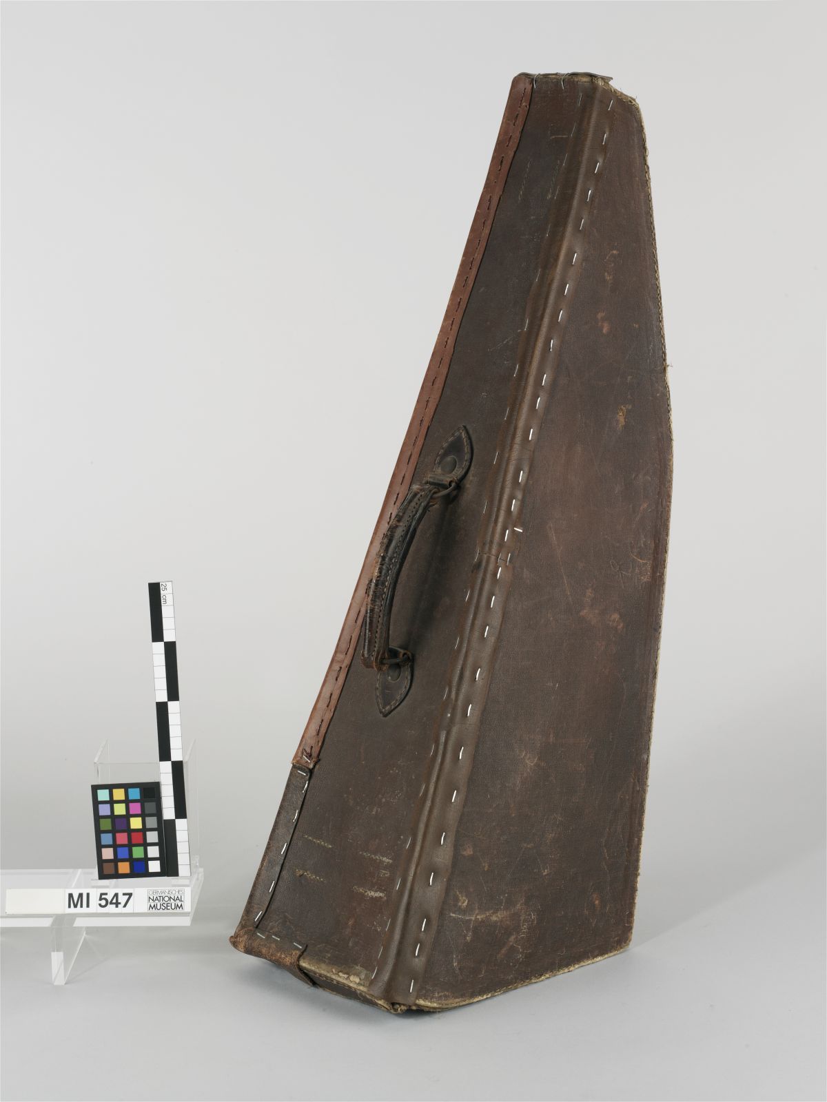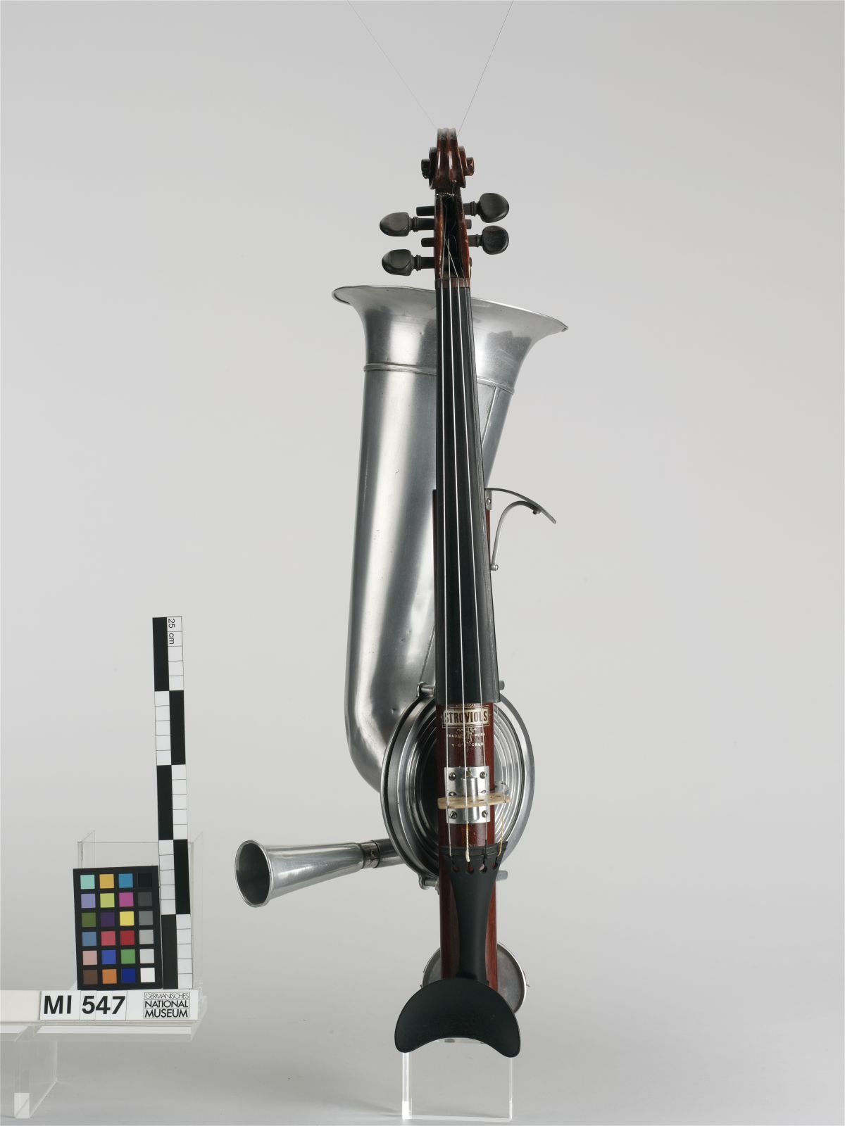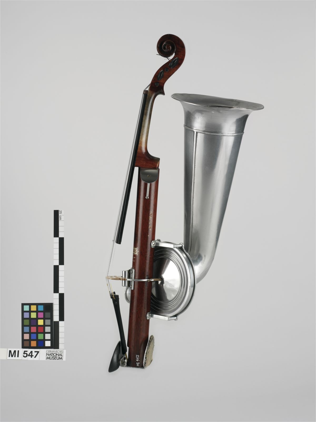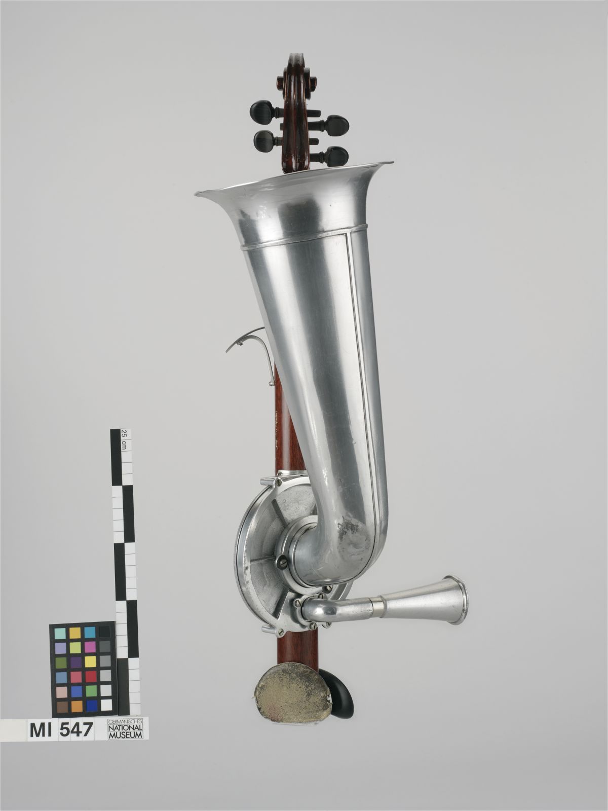 Tropenholz (?), Saitenhalter, Griffbrett und Wirbel: Ebenholz, Trichter: Aluminium