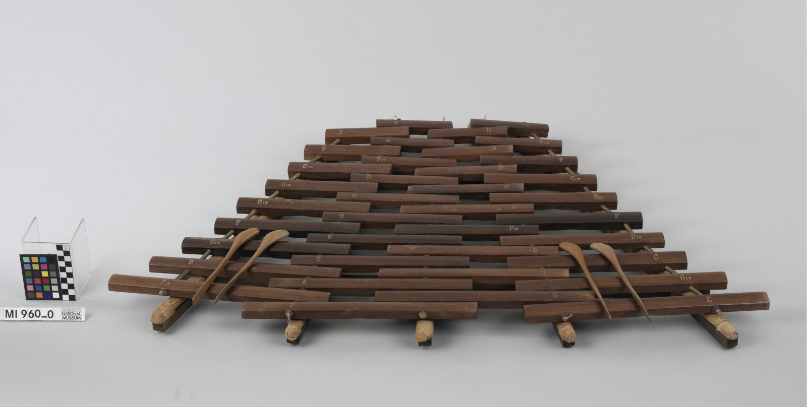 Klangstäbe: Dunkles Tropenholz; Auflagen: Stroh und Holz; Schlägel: Holz