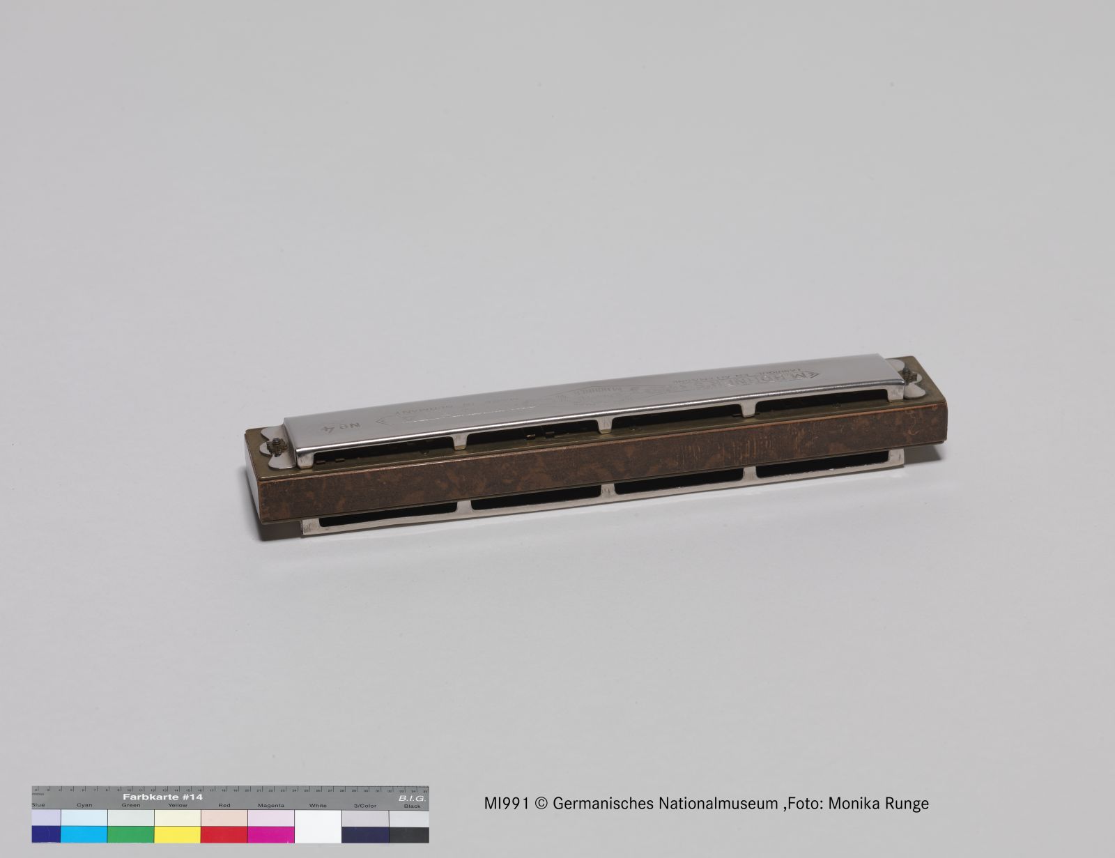 Korpus Obstholz (?) mit marmorierter Fassung; Verdeck verchromtes Metall; Stimmplatten und Zungen Messing.