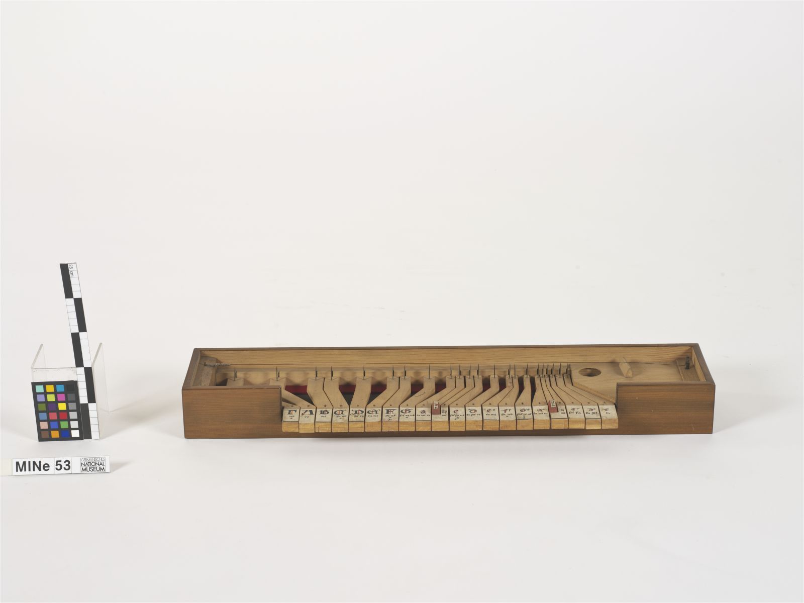 Korpus, Damm, Resonanzbodenauflagen Nadelholz, Resonanzboden wohl Fichte, Stimmstock Eiche, Steg und Tastenführungsleiste wohl Buche. Anhangstift Messing, Anhangstock Eiche. Waage"balken" Buche, Waagebalkenstifte Messing, einreihig. Papierscheiben und durchlochter Lederstreifen zur Tastenhöhenregulierung. Tastenhebel wohl Buche. Tastenbeläge Pergament mit Beschriftung in schwarzer und roter Tusche. Tastenrückfallpolster roter Filz. Wolleumwicklung zur Saitenabdämpfung, Messingblechtangenten.