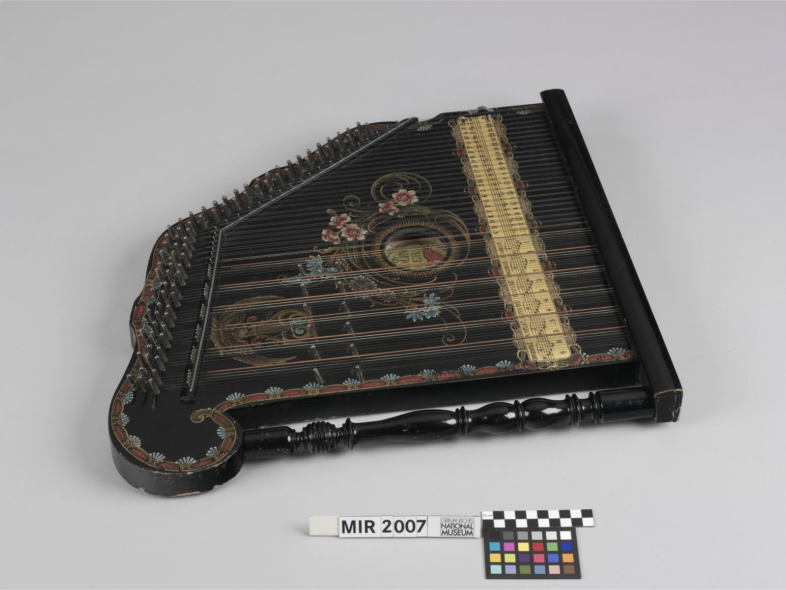 Nadelholz (?), schwarz lackiert, bedruckt, 25 freie Melodiesaitenpaare chromatisch c1 – c3, 6 Gruppen freier Begleitsaiten zu je 7 Saiten, Akkordfolge von den Melodiesaiten weg: C - Dur, G - Dur, F - Dur, A - Dur, E - Dur, Eisenwirbel, vernickelt, verchromt, mit quadratischem Kopf.