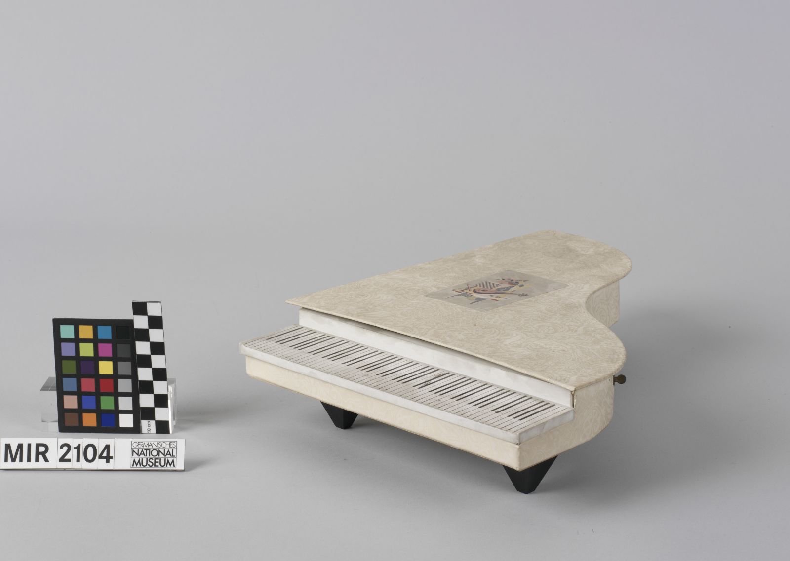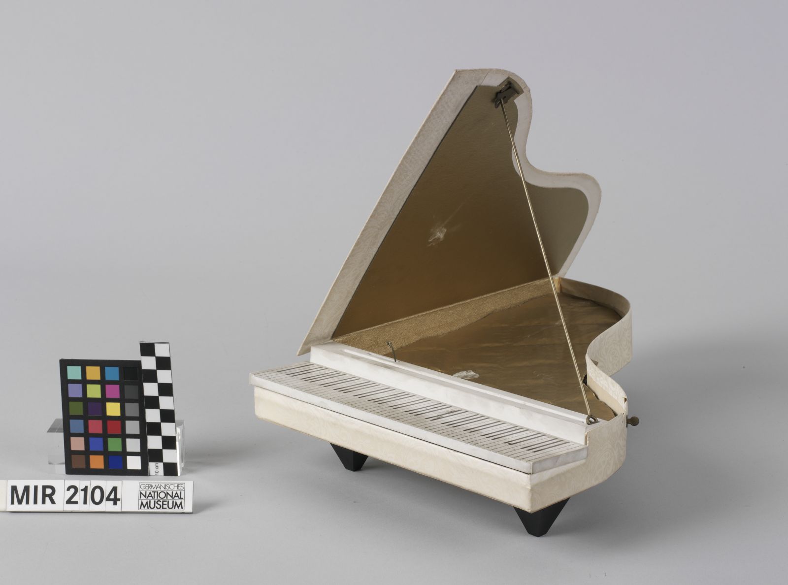 Kartongehäuse, teils mit geprägtem und bedrucktem Papier überzogen; Tastaturabdeckung Kunststoff; Spielwerk verschiedene Metalle.
