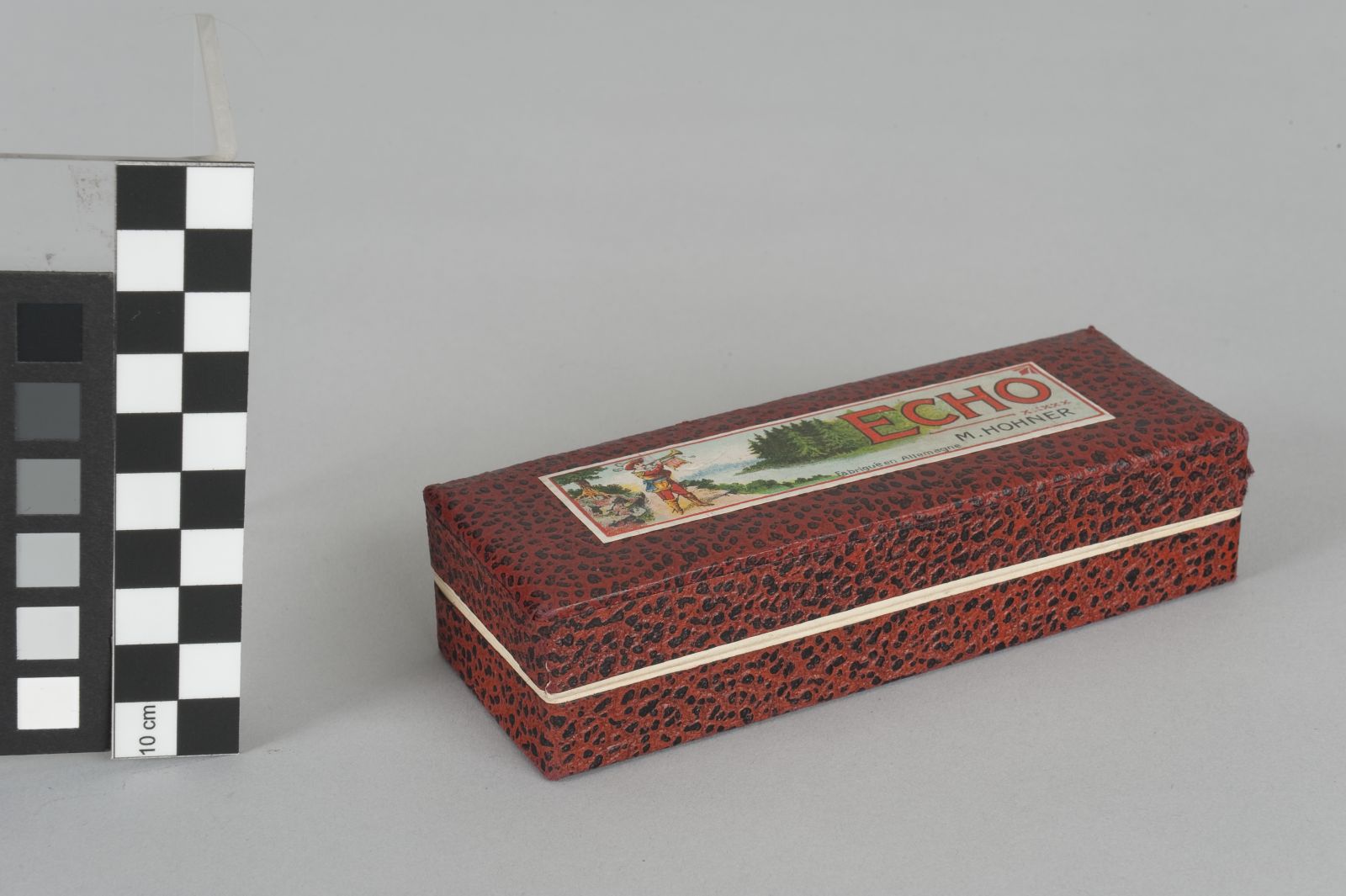 Kanzellenkörper Ahorn; Stimmplatte Messing; Deckel und Stimmzungen verschiedene Metalle; Etui Pappe, mit farbigem Papier beklebt und bedruckt.