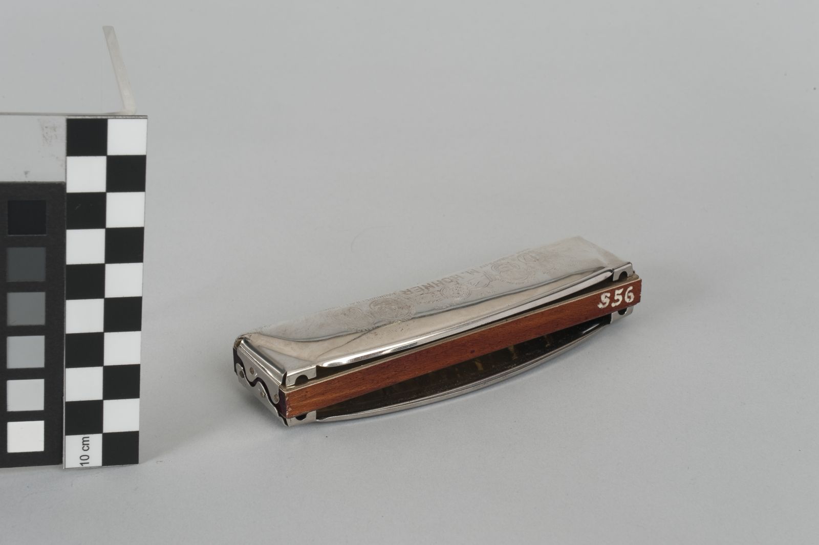Korpus Ahorn; Stimmplatte Messing; Deckel, Zungen etc. verschiedene Metalle; Etui Pappe, mit farbigem Papier beklebt und bedruckt.