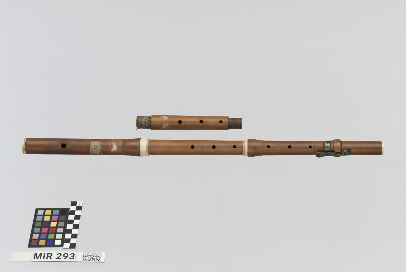 Korpus: Buchsbaum; Obere Fußzwingen: Silber; Kappe und alle anderen Zwingen: Elfenbein; Klappe: Silber