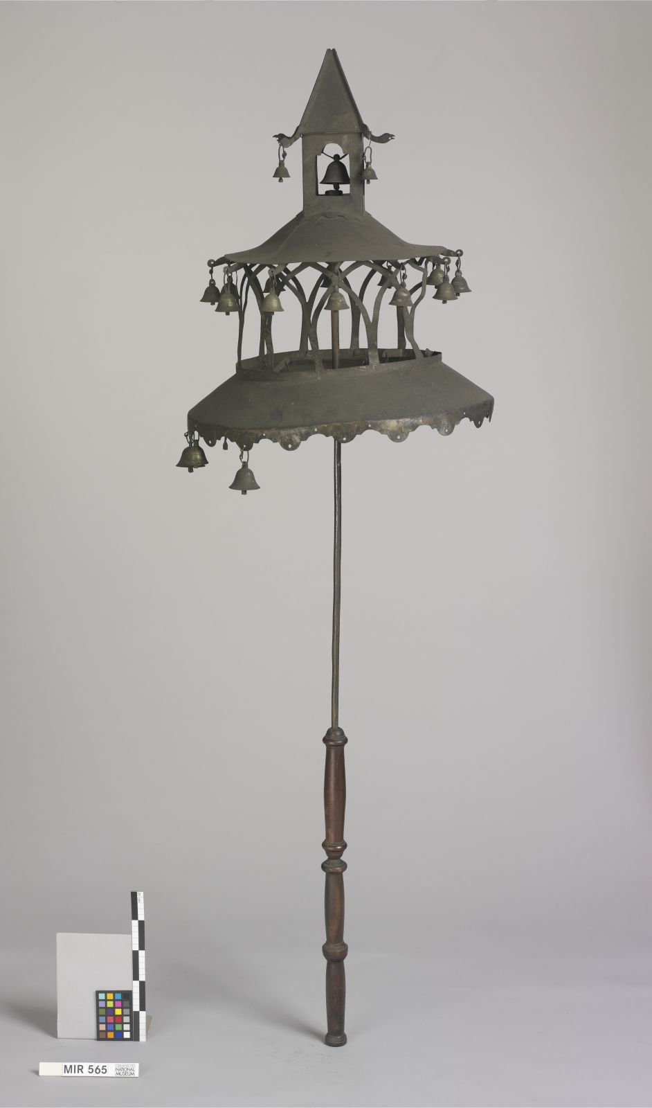 Stange: Metall; Griff: Pflaumenholz; Glöckchen: Messing; Klöppel: Eisen