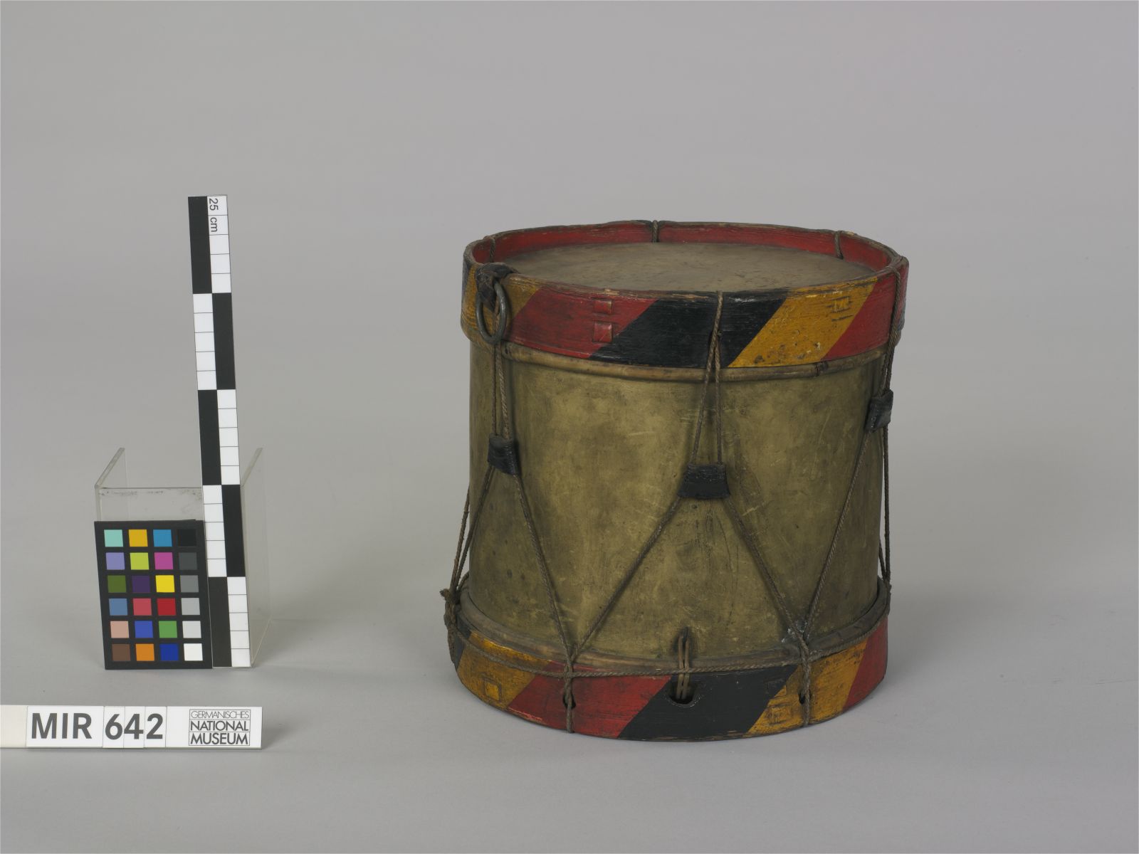 Zarge und Schnarrsaitenbügel: Messing; Spannreifen: Lärche