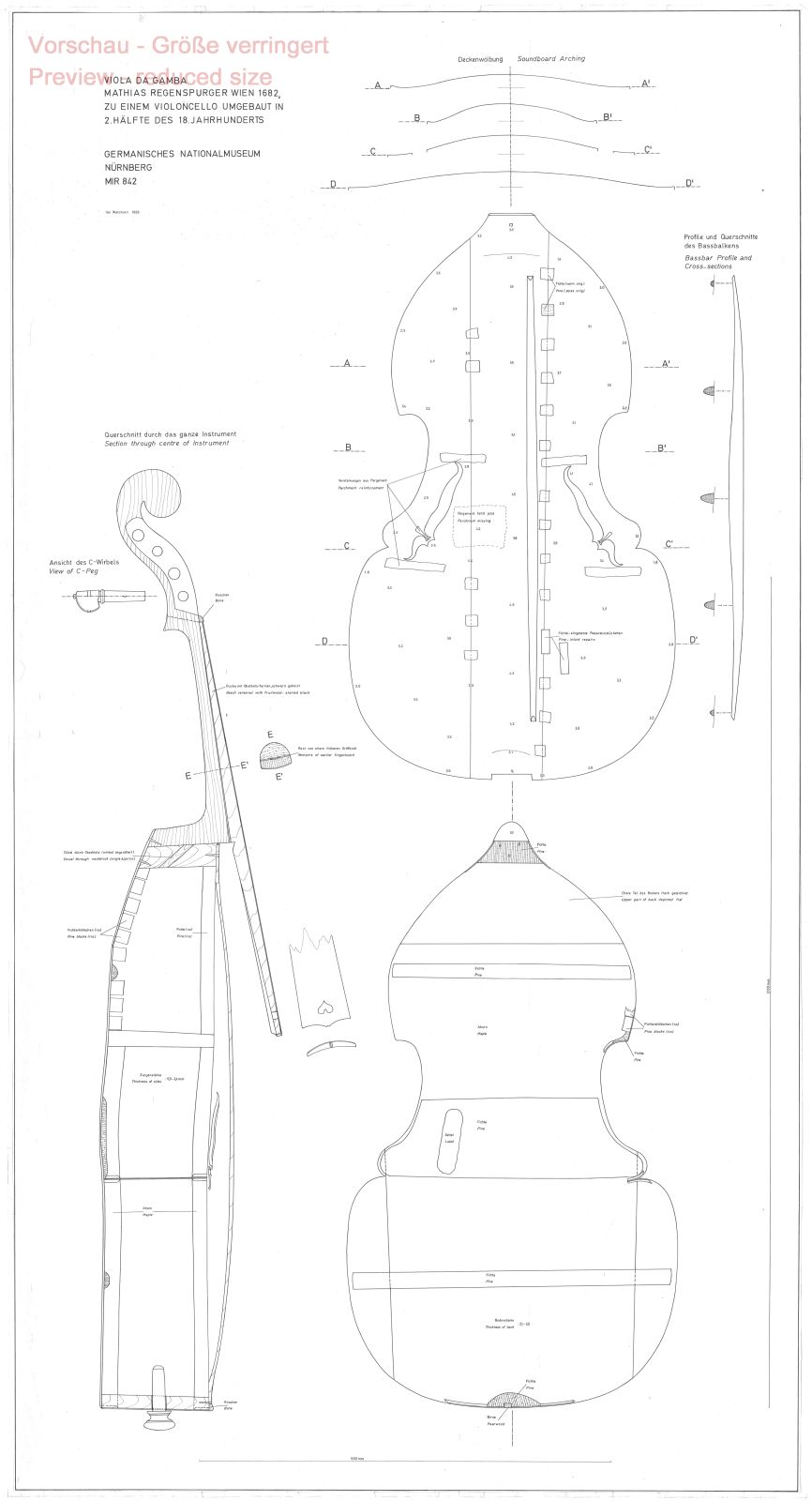 Decke Nadelholz; Boden und Zargen geflammter Ahorn; Hals, Wirbelkasten und Schnecke Ahorn; Griffbrett Ahorn mit schwarz gefasstem Obstholzfurnier.