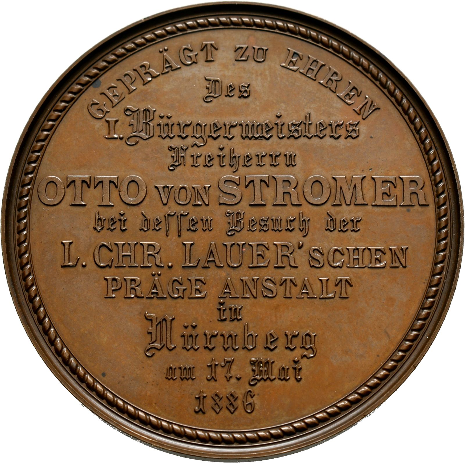 Nürnberg, Auf den Besuch des Ersten Bürgermeisters von Stromer in der Lauer'schen Prägeanstalt 1886