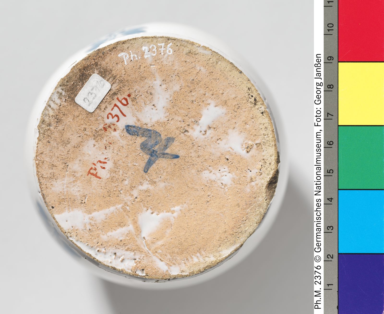 Gelblicher Scherben, weiß glasiert, blau bemalt