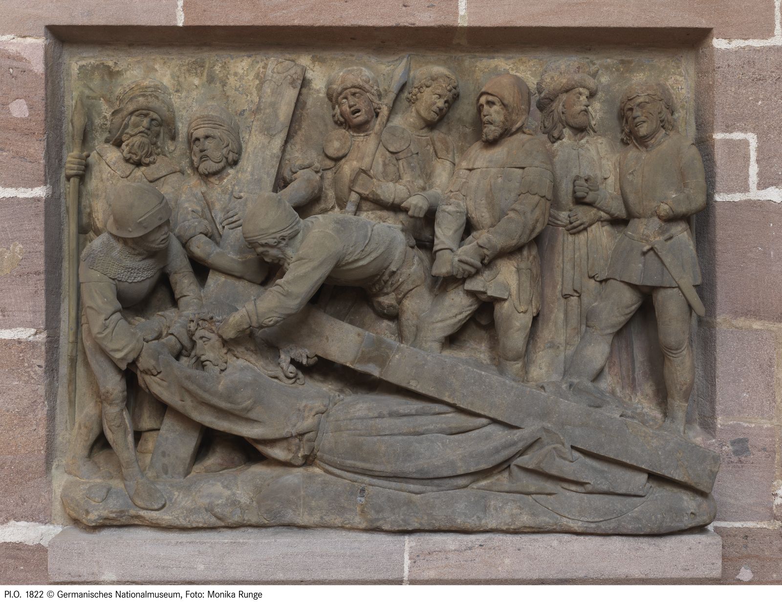 Der leicht schräg gestellte Querbalken markiert den Goldenen Schnitt und verleiht der Szenerie somit eine besondere Spannung, zumal er das Zentrum des Geschehens hinterfängt. Jesu Körper liegt wie ein Wiegemesser gebogen am Boden und bildet einen spannungsreichen Kontrast zur harten Linearität des auf ihm lastenden Kreuzstamms. Die über dem Balken sichtbaren Füße veranschaulichen das aufsteigende Terrain des Schauplatzes. Während einer der Büttel den Querbalken festhält, versucht ein Behelmter mit überkreuz gestellten Beinen den zu Boden Gegangenen an den Unterarmen nach oben zu ziehen. Er neigt seinen freiplastisch gebildeten Oberkörper dabei weit aus der Bildebene heraus. Ein anderer beugt sich von hinten über den Kreuzstamm und packt Jesus brutal an den Haaren, um ihn auf die Beine zu zwingen. Die Hände des nächsten, eines Mannes in Harnisch und mit gezaddeltem Rock, umgreifen den an die Hüften Jesu führenden Strick, und suchen das Ziel, den kraftlosen Körper zu heben, ebenfalls zu unterstützen. Die einem stämmigen Ausfallschritt geschuldete Haltung dieses Akteurs verdeutlicht die mit seinem Zugriff verbundene Mühe.