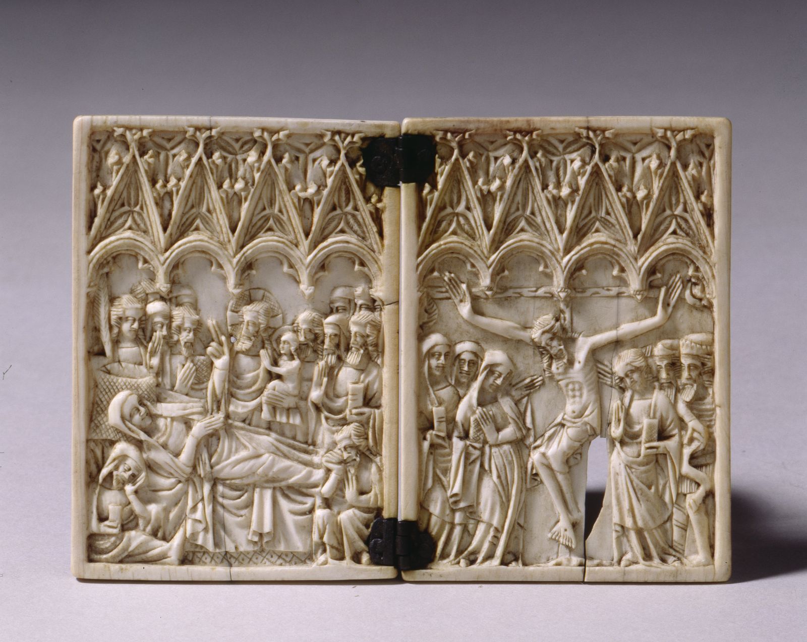 Elfenbeindiptychon mit Marientod und Kreuzigung