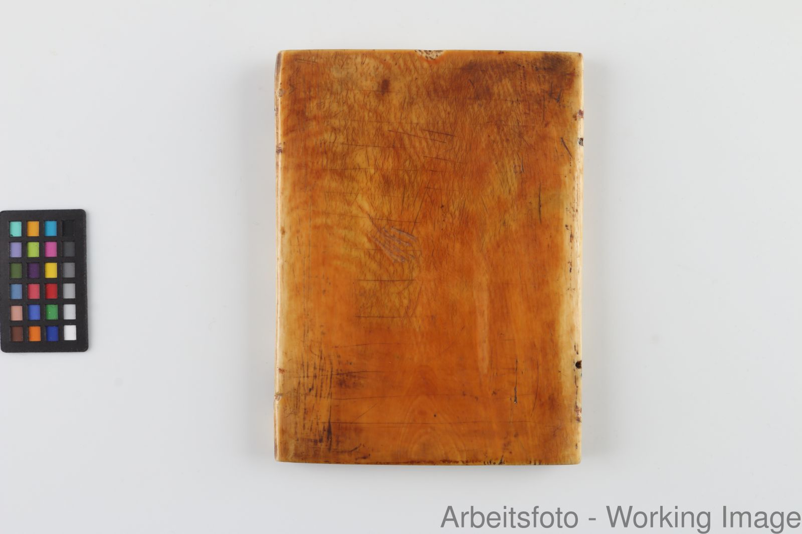 Elfenbein - linker Flügel: am rechten Rand Einschnitte für Scharniere, am linken zwei Durchbohrungen