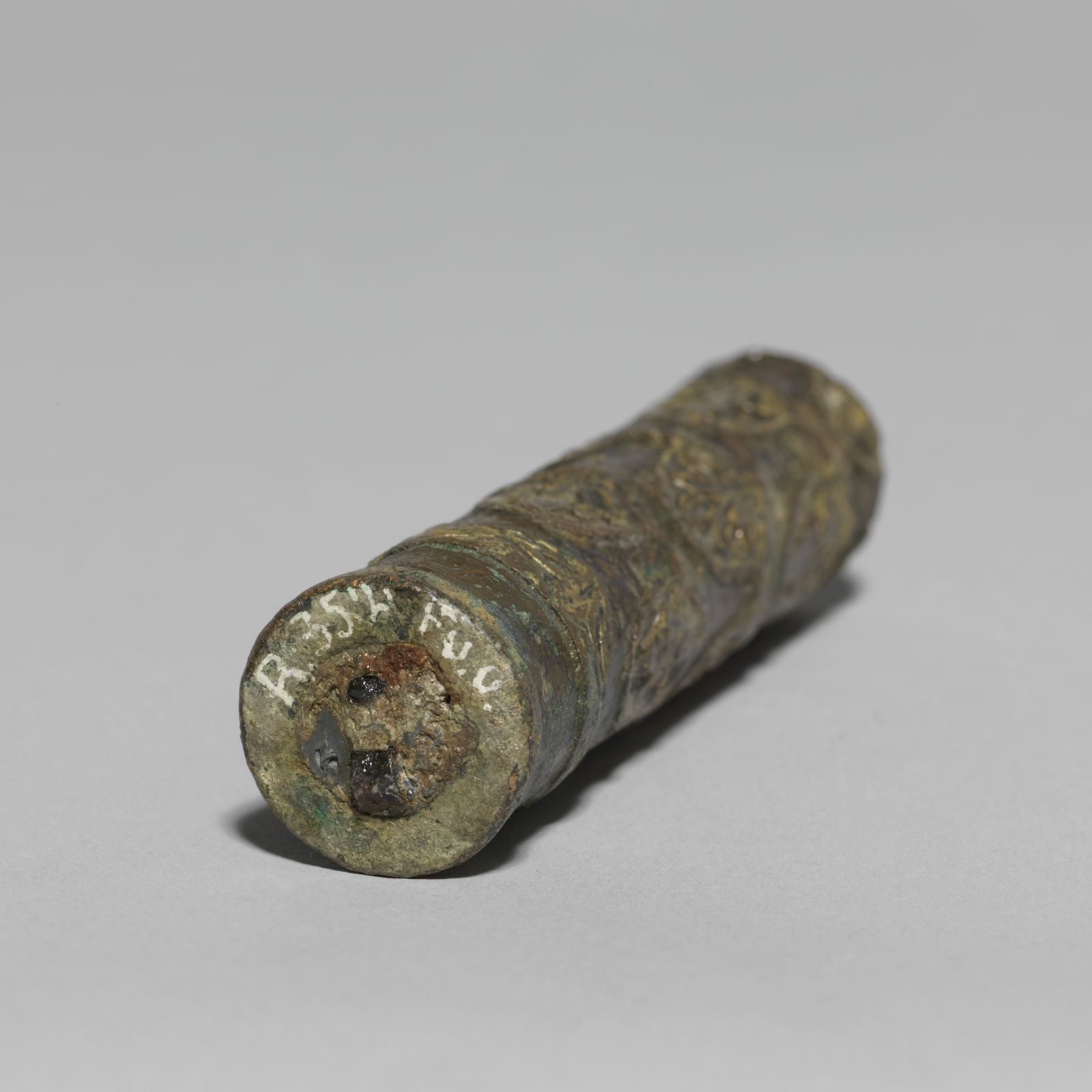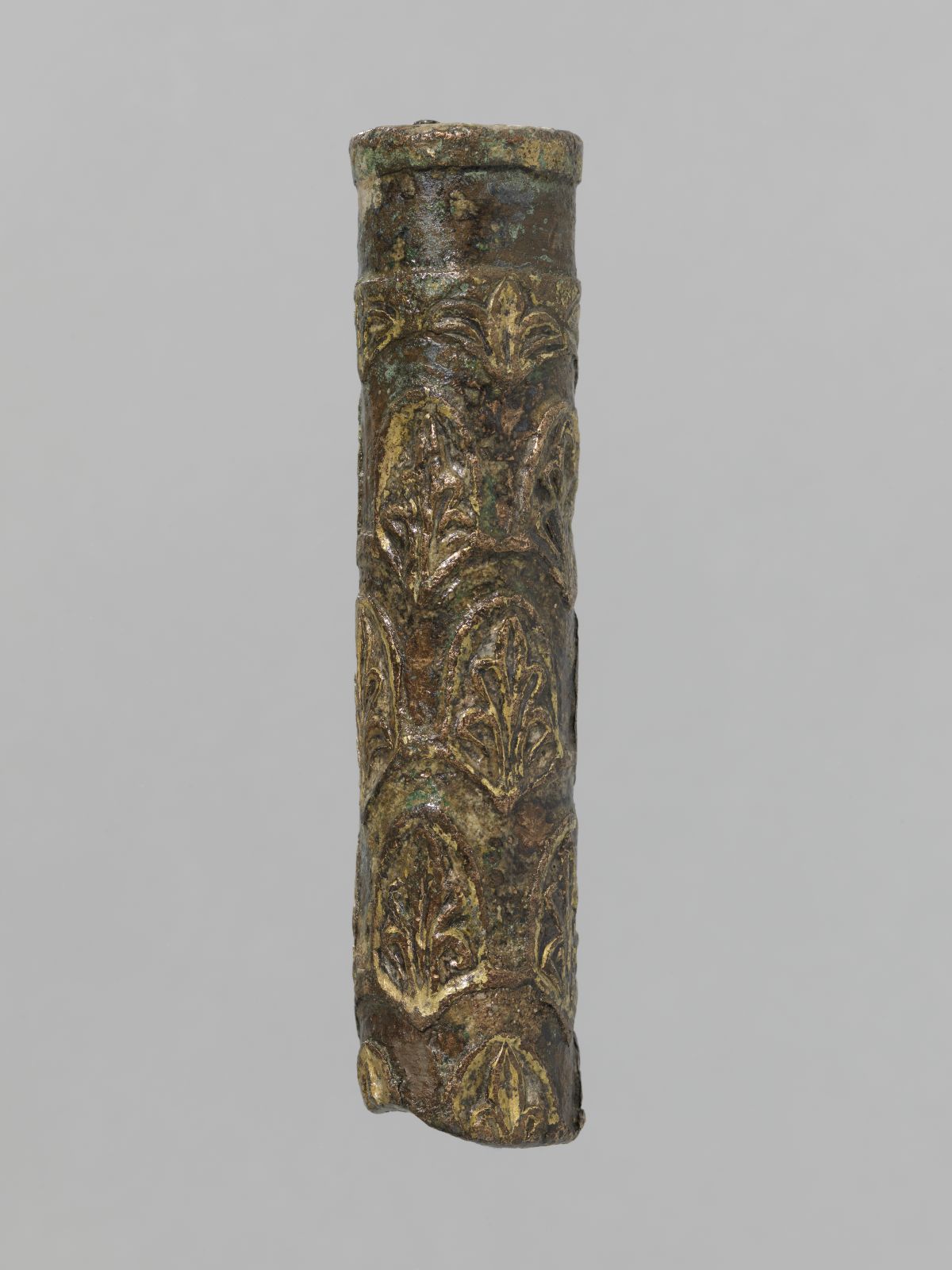 Im Wachsausschmelzverfahren gegossener Bronzezylinder, die einzelnen Palmetten aus dem Wachs "freihändig" herausgearbeitet; Zylinder mit Blei gefüllt, Blei mittig durchbohrt und mit einem Eisenstift versehen, an einer Seite als Öse auslaufend und abgeschliffen (sekundär). Auf dem Bronzezylinder sind Bleche aufgesetzt und verklebt; diese sgoldplattiert; parallel verlaufende Kerben entlang der Palmetten und Aussparungen lassen auf eine heute verloren gegangene Verzierung (aufplattierte Metallbänder?) schließen. Palmetten und „Lilien“ sind individuell gefertigt, vermutlich mittels Kerbschnitt.