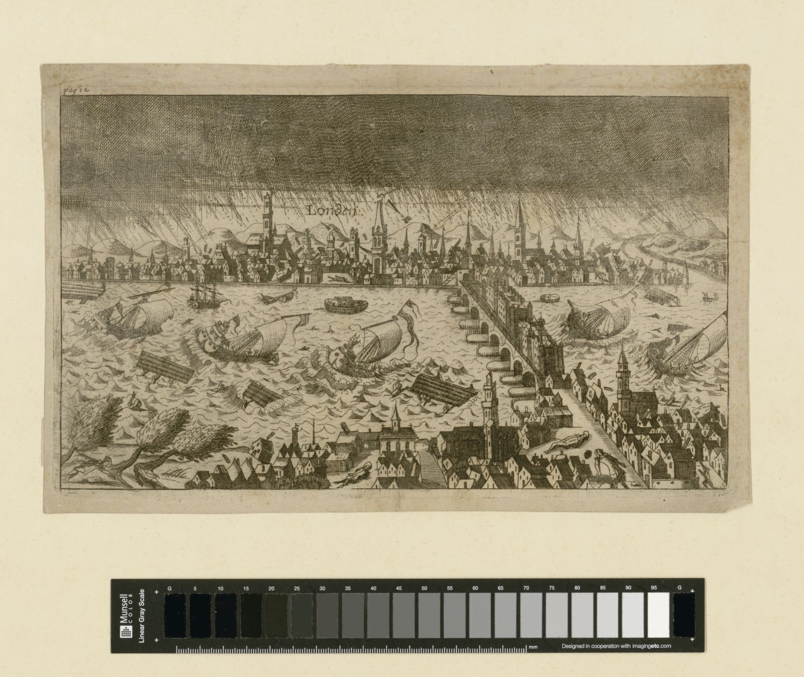 London, Ansicht mit Themseufer und London Bridge während eines Sturms