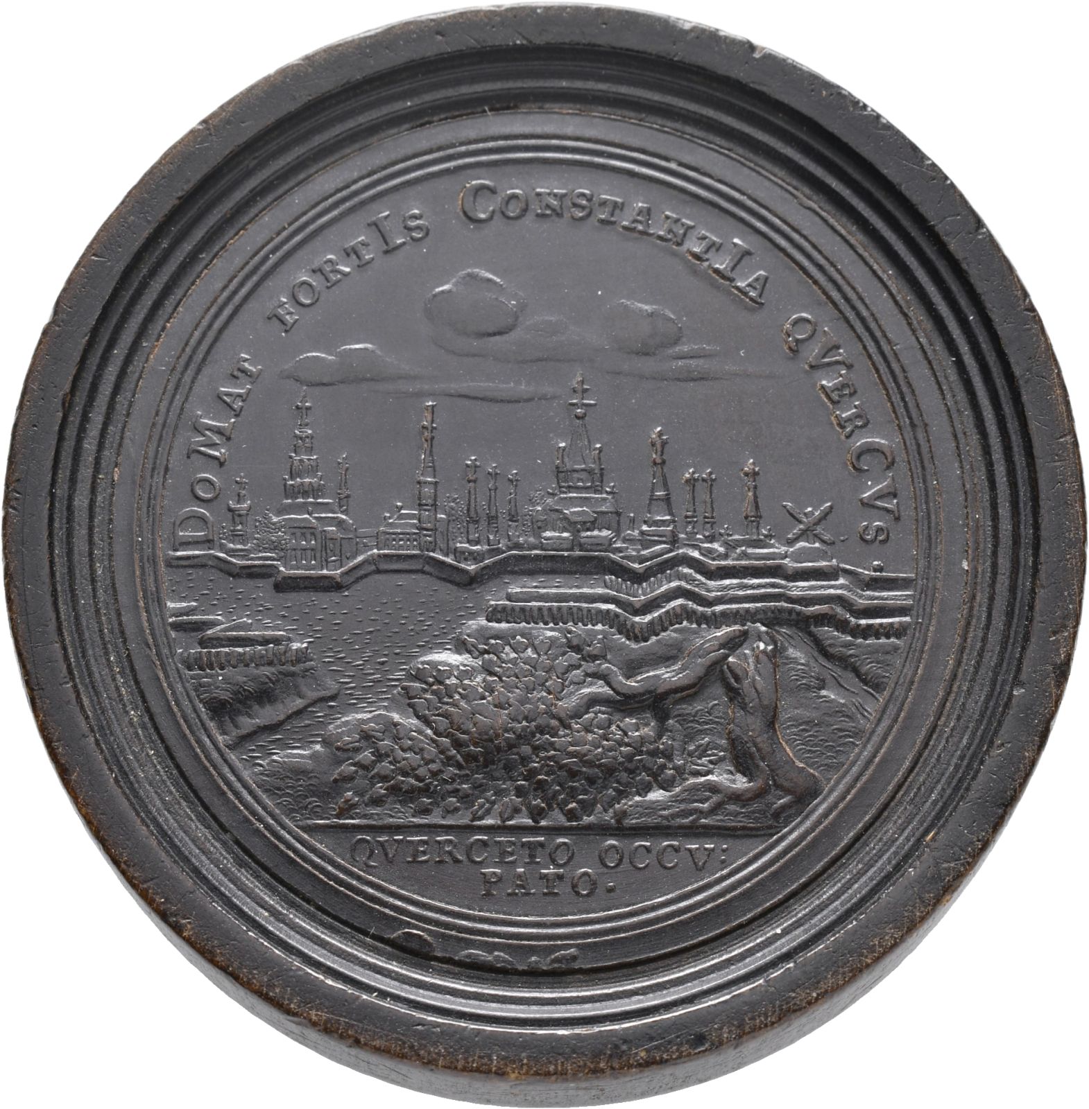 Aus 3 Teilen zusammengesetzt. Rahmen und Vs. aus Ahorn (?), Rs. aus Birnbaum (?), geschwärzt, gedrechselt, geprägt