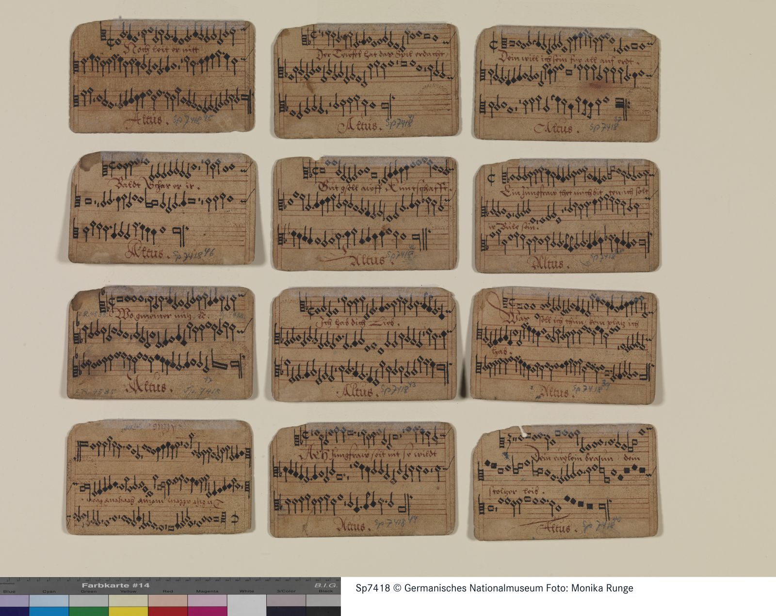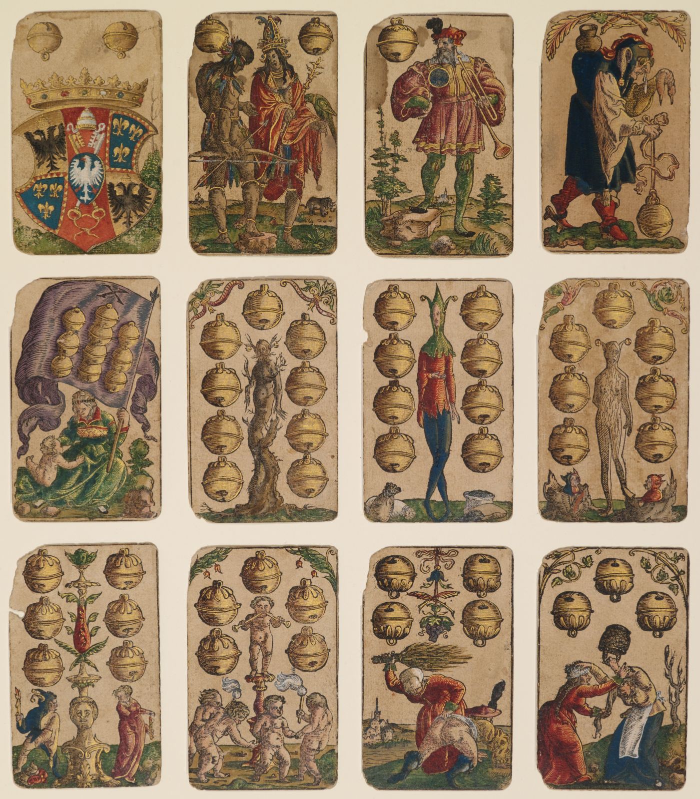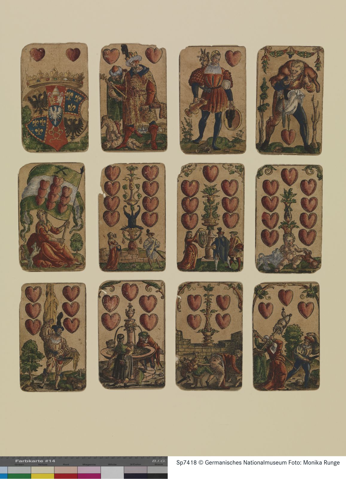 (3 Asse: vorne Federzeichnungen, koloriert und gold gehöht, hinten in Schwarz und Rot),