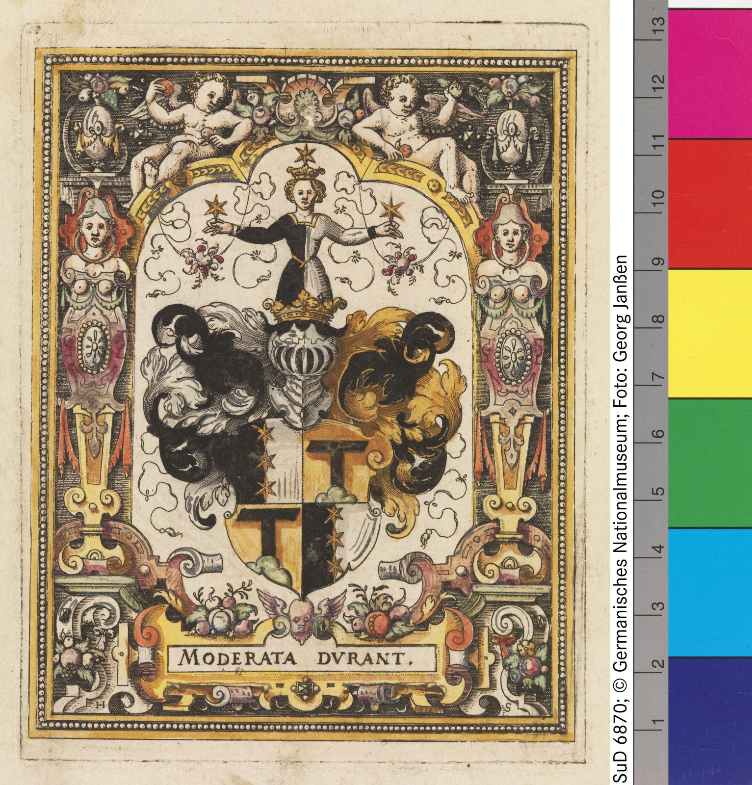 Radierung, koloriert in Zinnober, Kupfergrün, Ocker, Goldfarbe