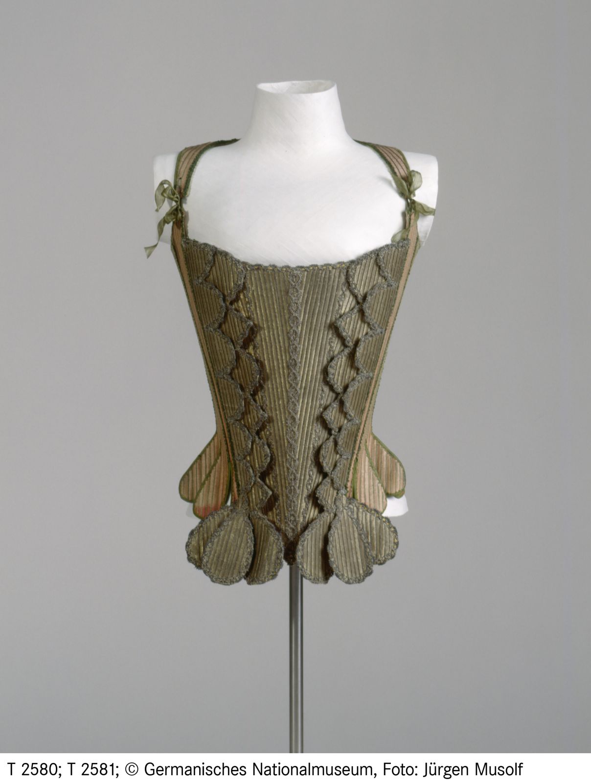 Obermaterial: Seide, lachsfarben; Leinwandbindung; Seide, beige; Metallfaden, goldfarben; Köperbindung; Klöppelspitze: Metallfaden; Futter: Leinen; Seide; Borten: Seide; Fischbein
