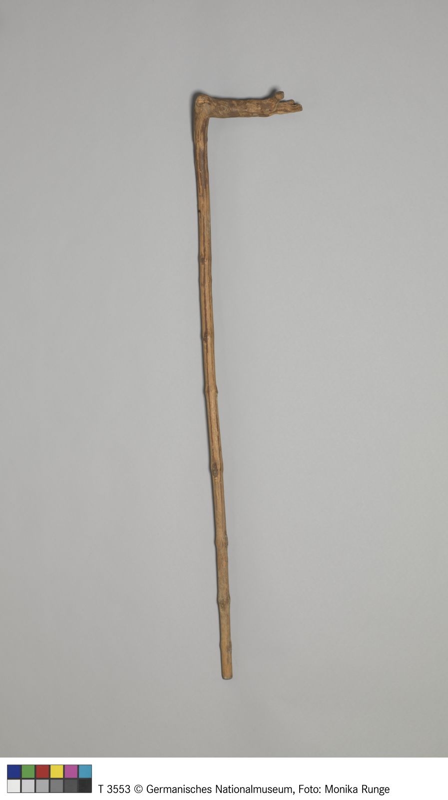 Ast- und Wurzelholz, geschnitzt, teilweise entrindet, Zwingen mit Eisen oder Messing beschlagen