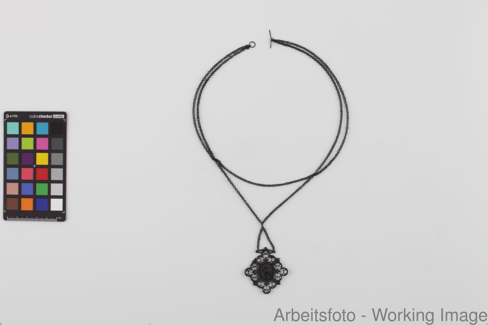 Kette: L. 45,2cm; Anhänger: H. 4,6cm; B. 4,2cm; Bildnismedaillon: H. 1,6cm; B. 1,2cm