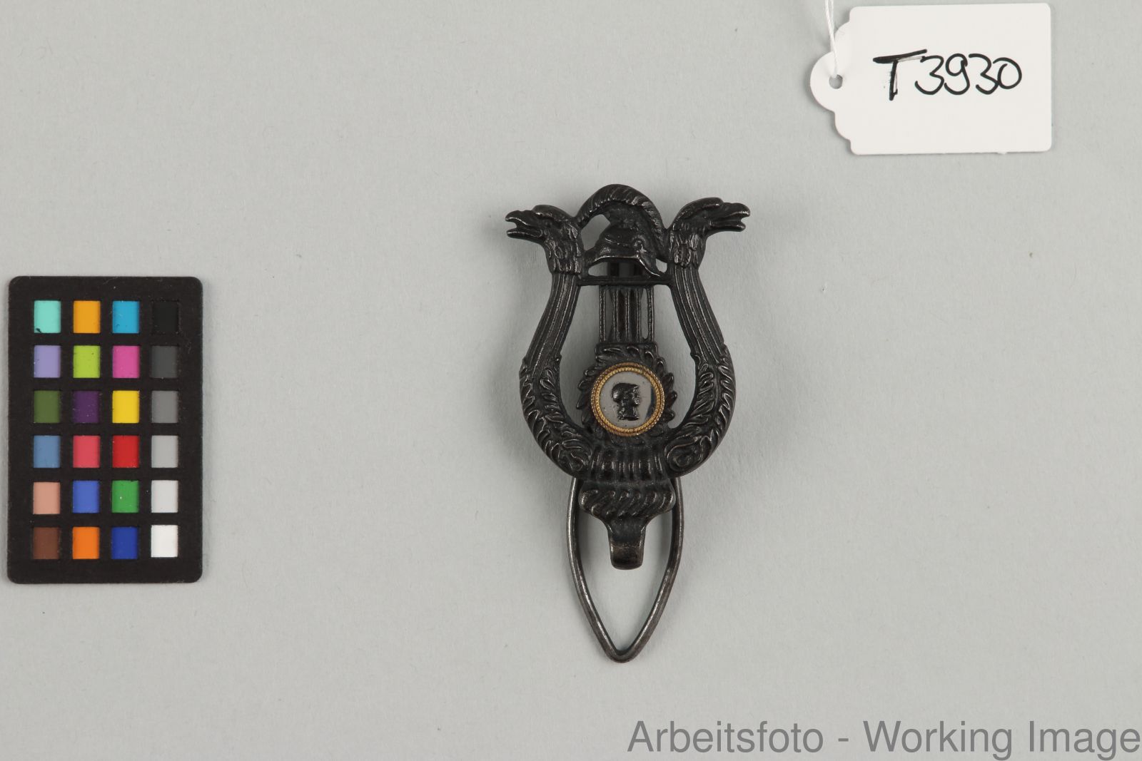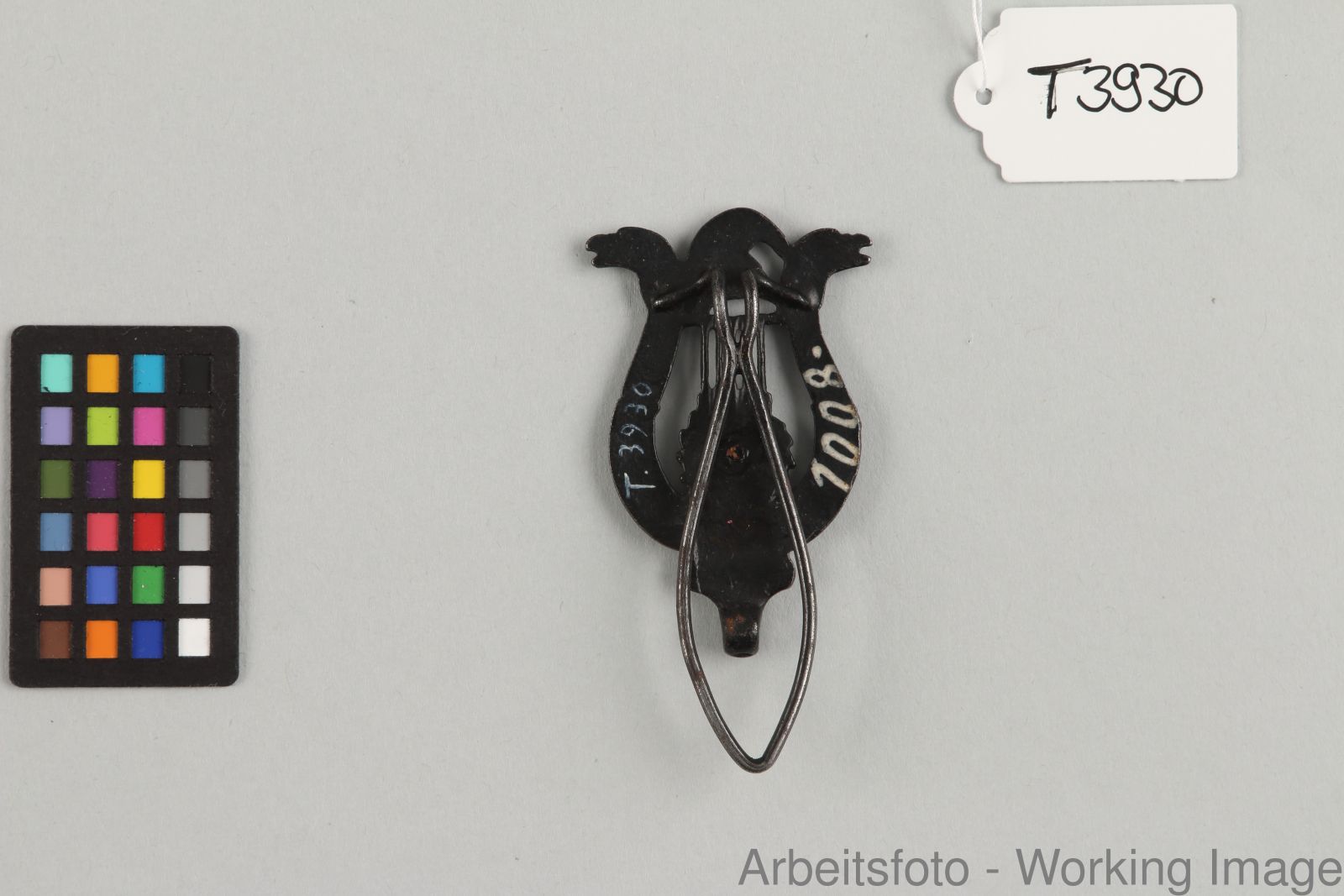 L. 6,3 cm; B 3,3 cm, T 0,8 cm; Zierstück: L. 4,4 cm; B. 3,3 cm; Medaillon: Dm. 1 cm