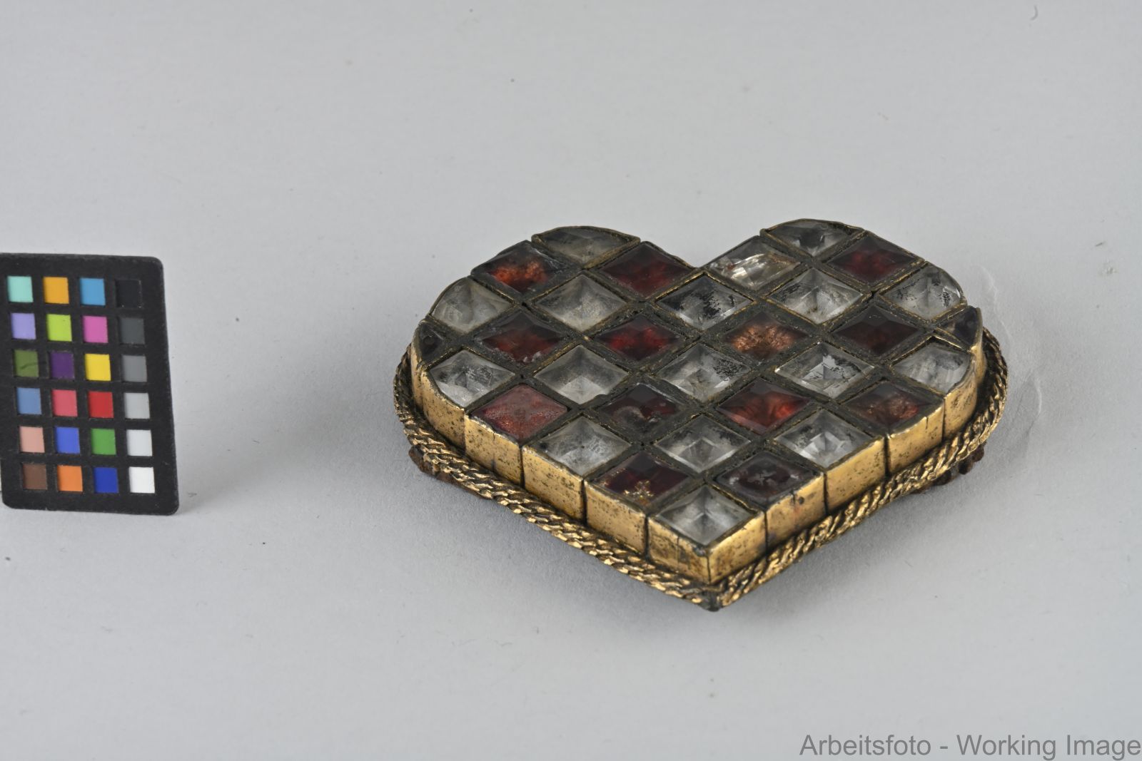 Messingblech, vergoldet, Glassteine, rote und silberfarbe Folie unterlegt, Leder
