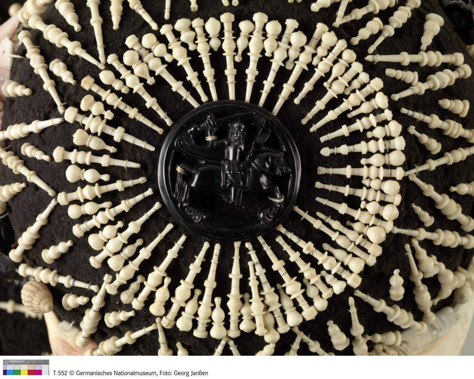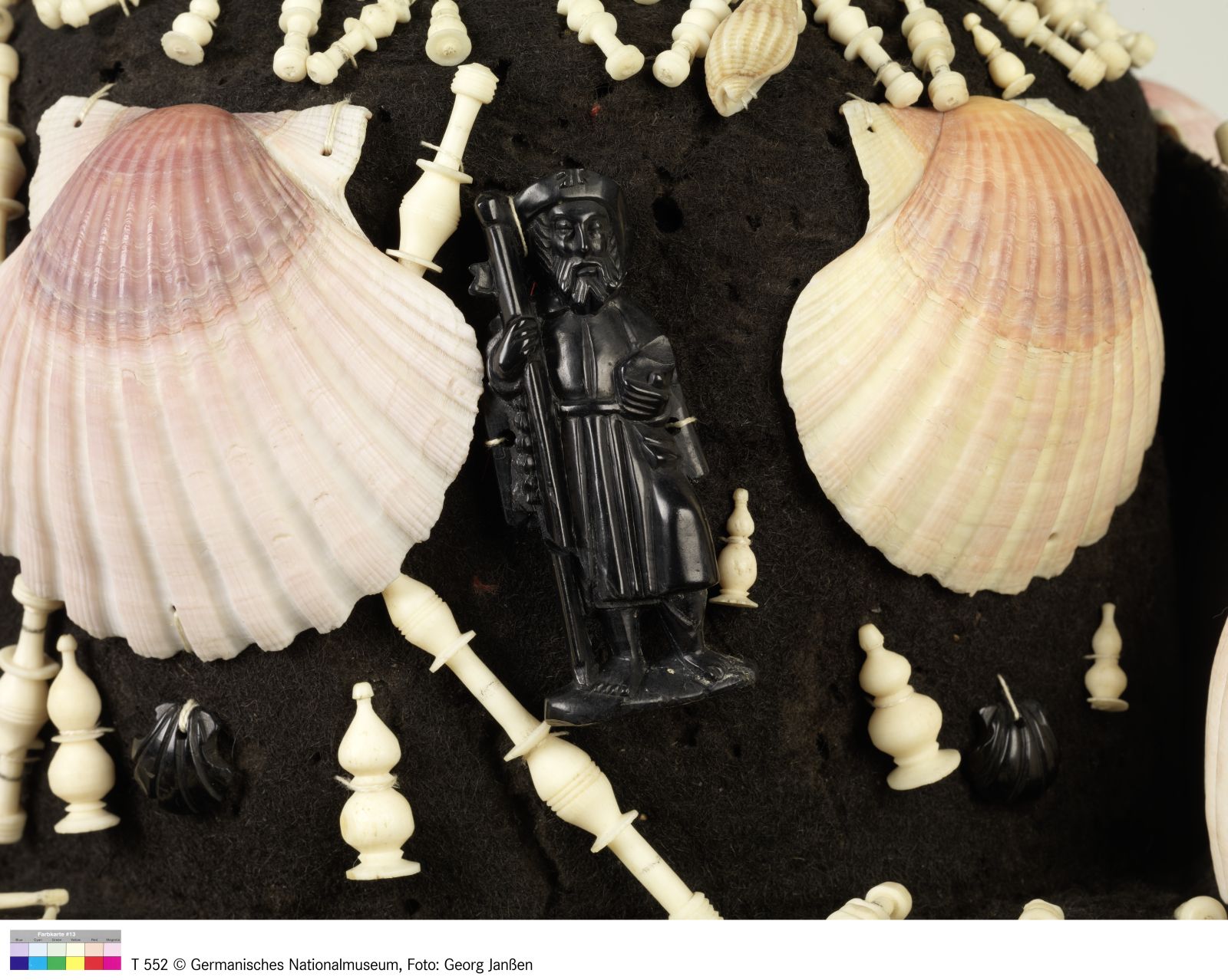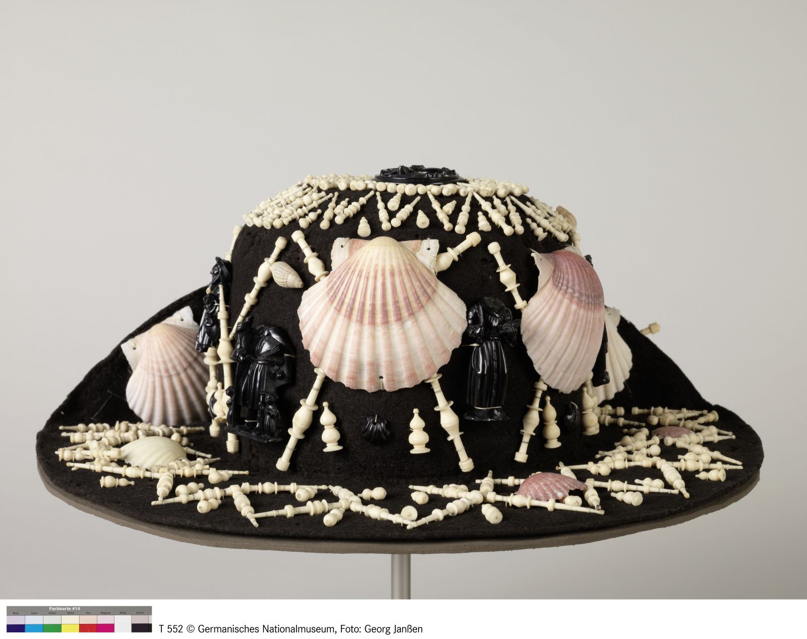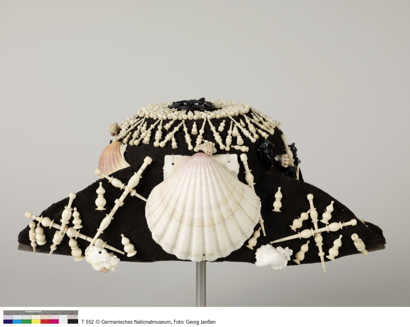 Wollfilz, schwarz, Seidenborte, Muschel, Bein, Gagat