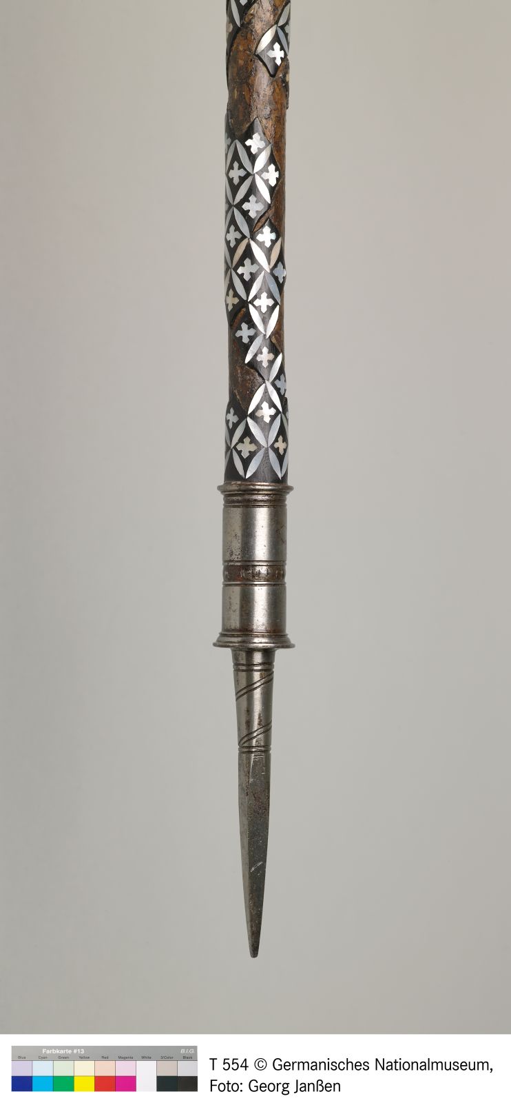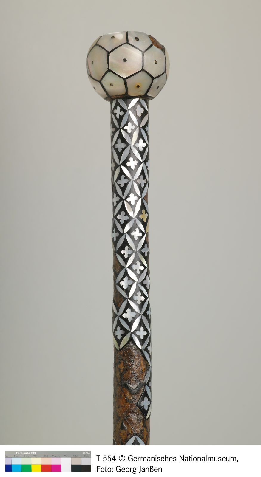 Holz, Perlmutt (teilweise ergänzt), Eisen, schwarze Kittmasse, Messingstifte