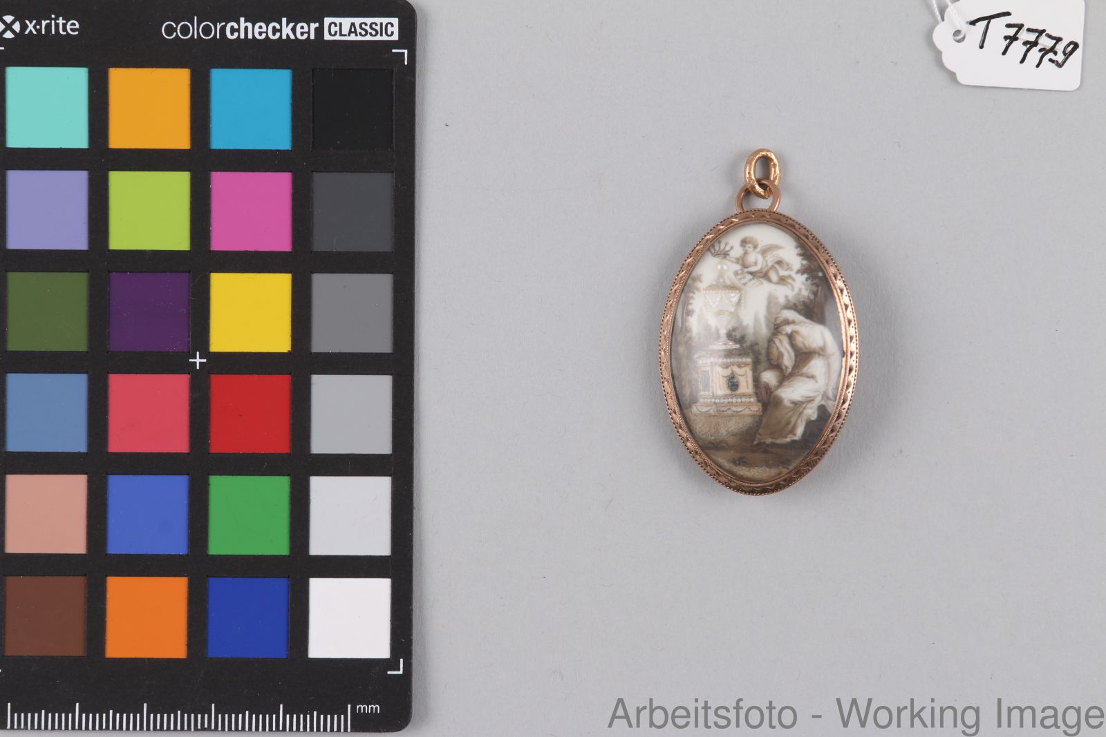 Gold, Sepiamalerei auf Elfenbein, Perlmutt, Haar, Glas