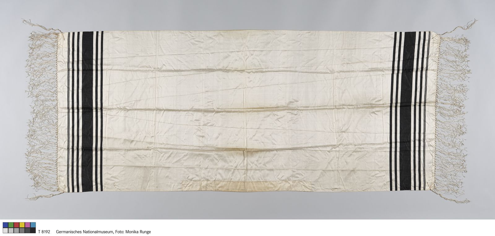 Seidenköper, weiß, dunkelblaue Streifen in gemusterter Ripsbindung; Fransen und Schaufäden Seide, weiß, Ecken unterlegt mit Seidentaft, weiß