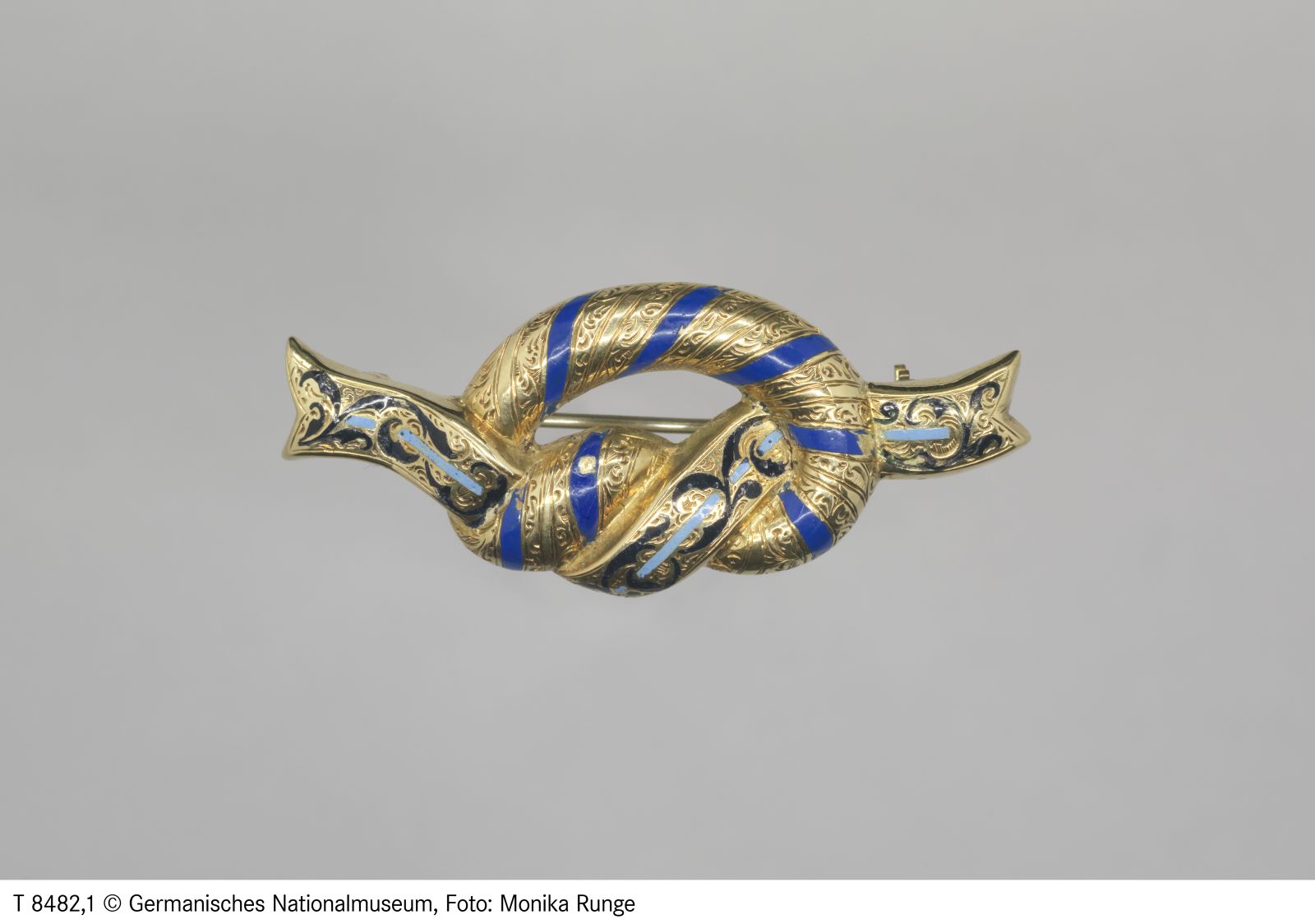 Brosche: L. 4,6 cm, T. 0,9 cm; Kette geschlossen: L 19,8 cm