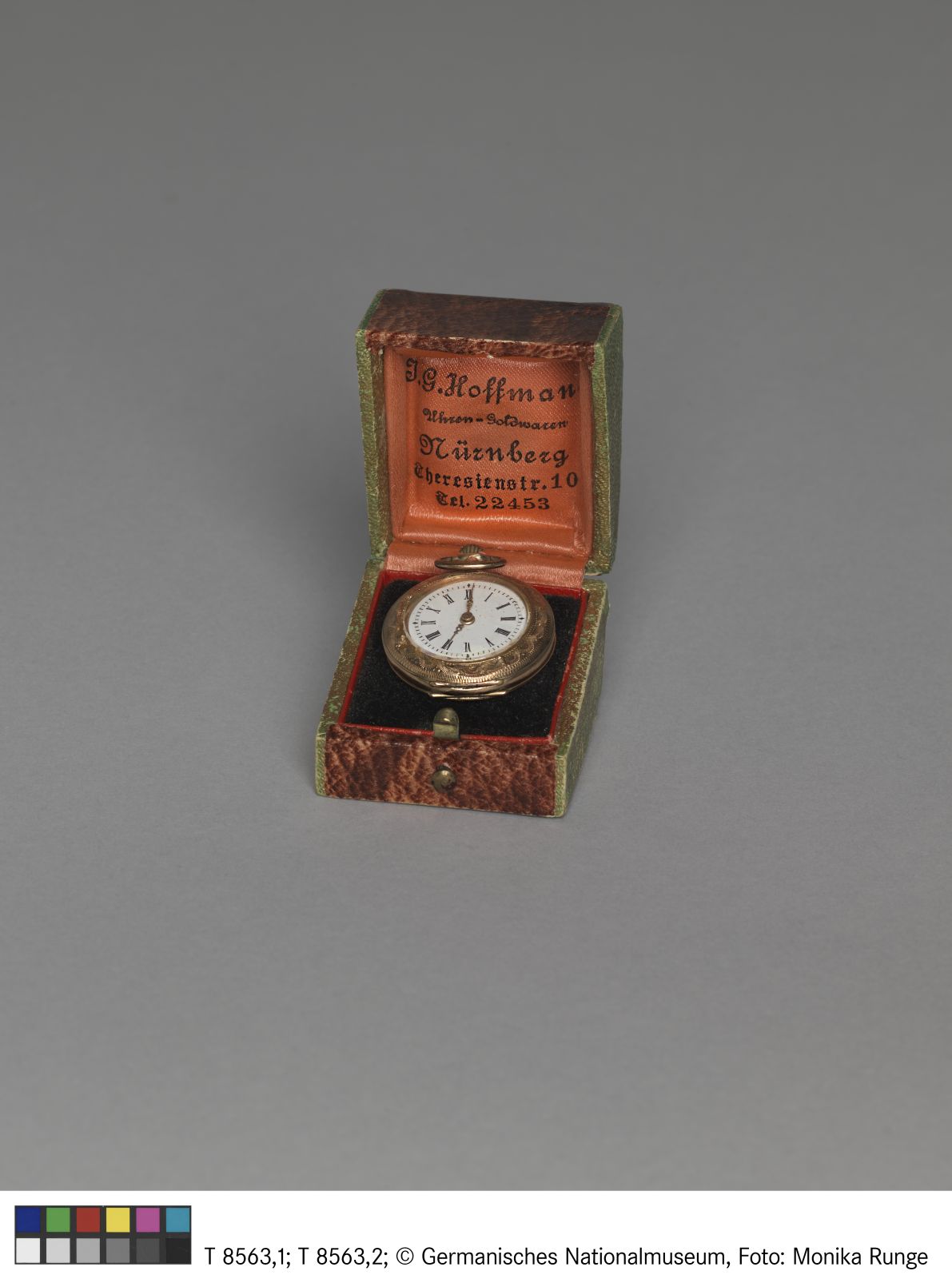 Schatulle: Pappe, kaschiert mit Papier Lederimitat und Goldprägung, innen ausgekleidet im Deckel mit rosafarbener Seide und Adressaufdruck, im Kasten schwarzer Samt mit Einsteckschlitz für einen Ring (ursprünglich nicht für Uhr), Stempel im Deckel VS: Seriennummer 140391/ 0,585 (Feingehalt) / Zwei Eichhörnchen Marken aus der Zeit von 1882-1933 /JPC im Lorbeerkranz (Meistermarke);