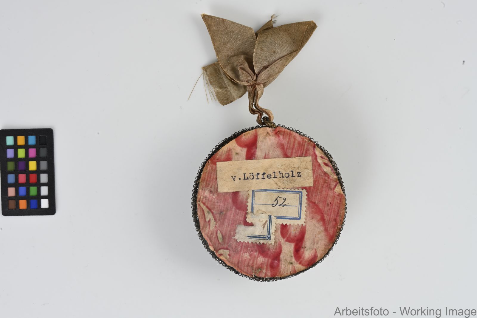 Dm. Medaillon 7,0 cm; L. mit Schleife 12,3 cm; T. 1,9 cm