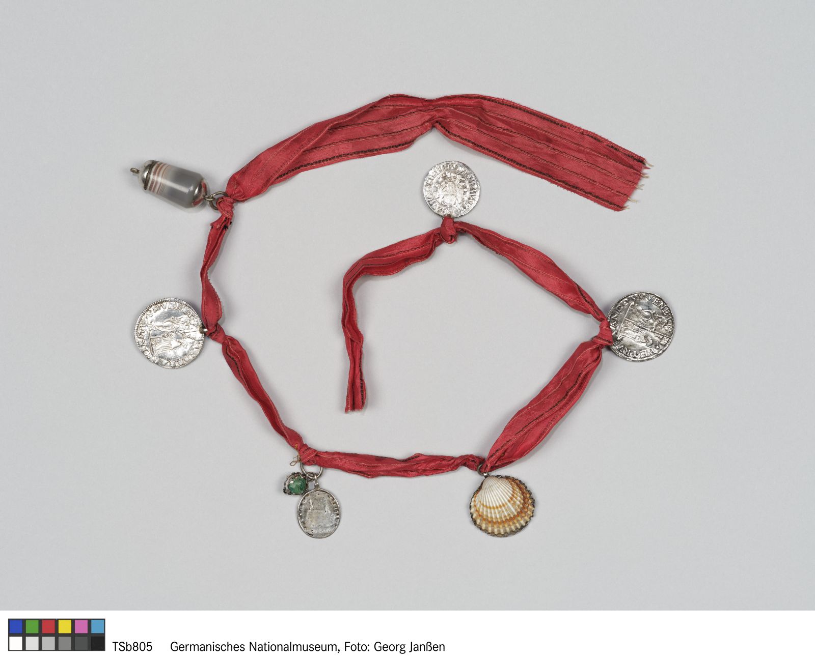 Seidenband, Metall (Silber oder versilbert?), Achat, Malachit, Muschel