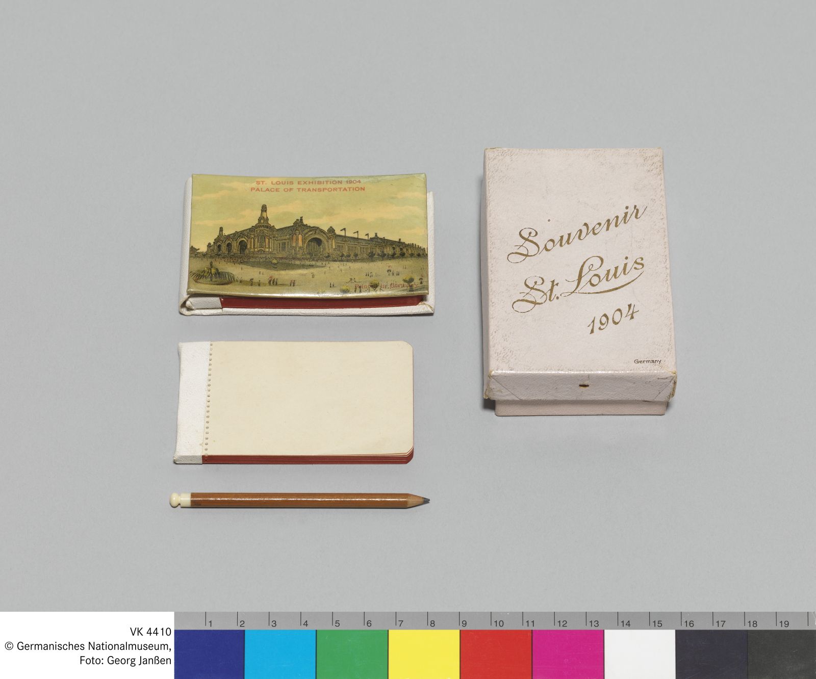 Schachtel: H. 8,9 cm, B. 5,8 cm, T. 2,7 cm; Notizblock: H. 8,4 cm, B. 4,8 cm, Bleistift: L. 8 cm, Dm. 0,5 cm