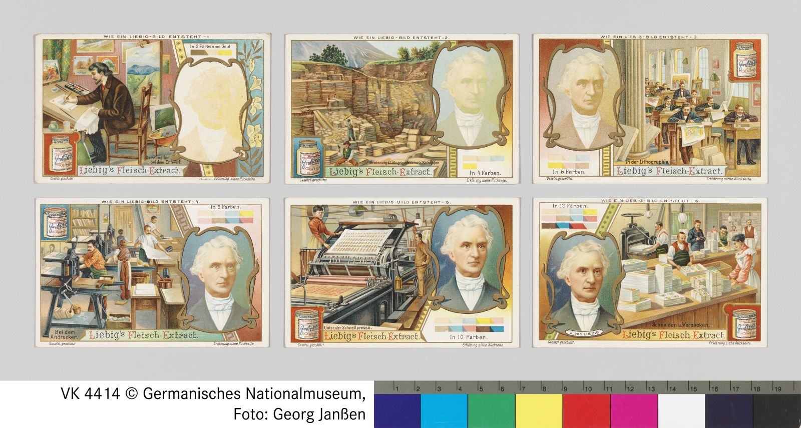 Sechs Liebig-Sammelbilder "Wie ein Liebig-Bild entsteht"
