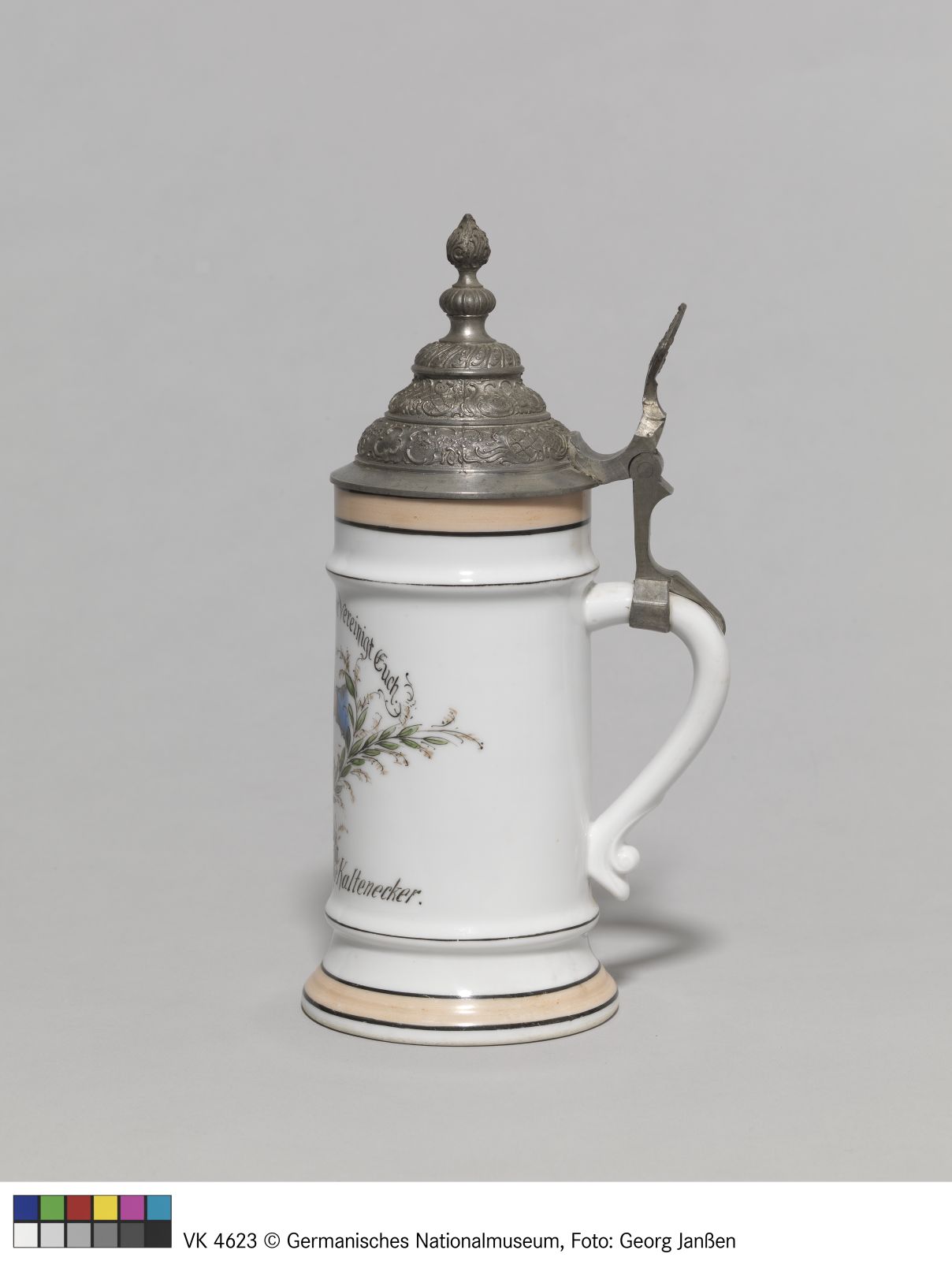 Porzellan, Umdruckverfahren, handbemalt, Lithophanie; Zinn, gegossen; Porzellan geklebt