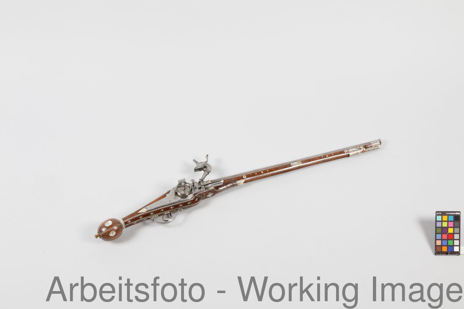 Schaft: Nussbaumholz, Bein u. Perlmutt - eingelegt, graviert; Afterkugel: Bein - eingelegt