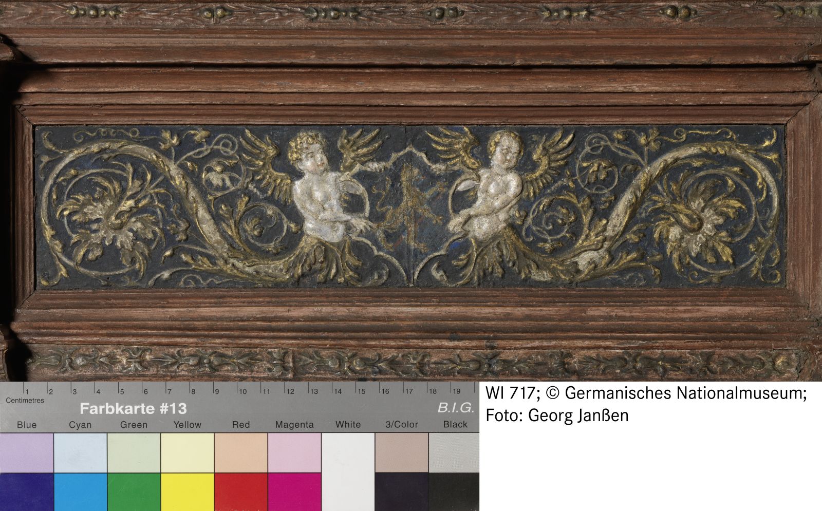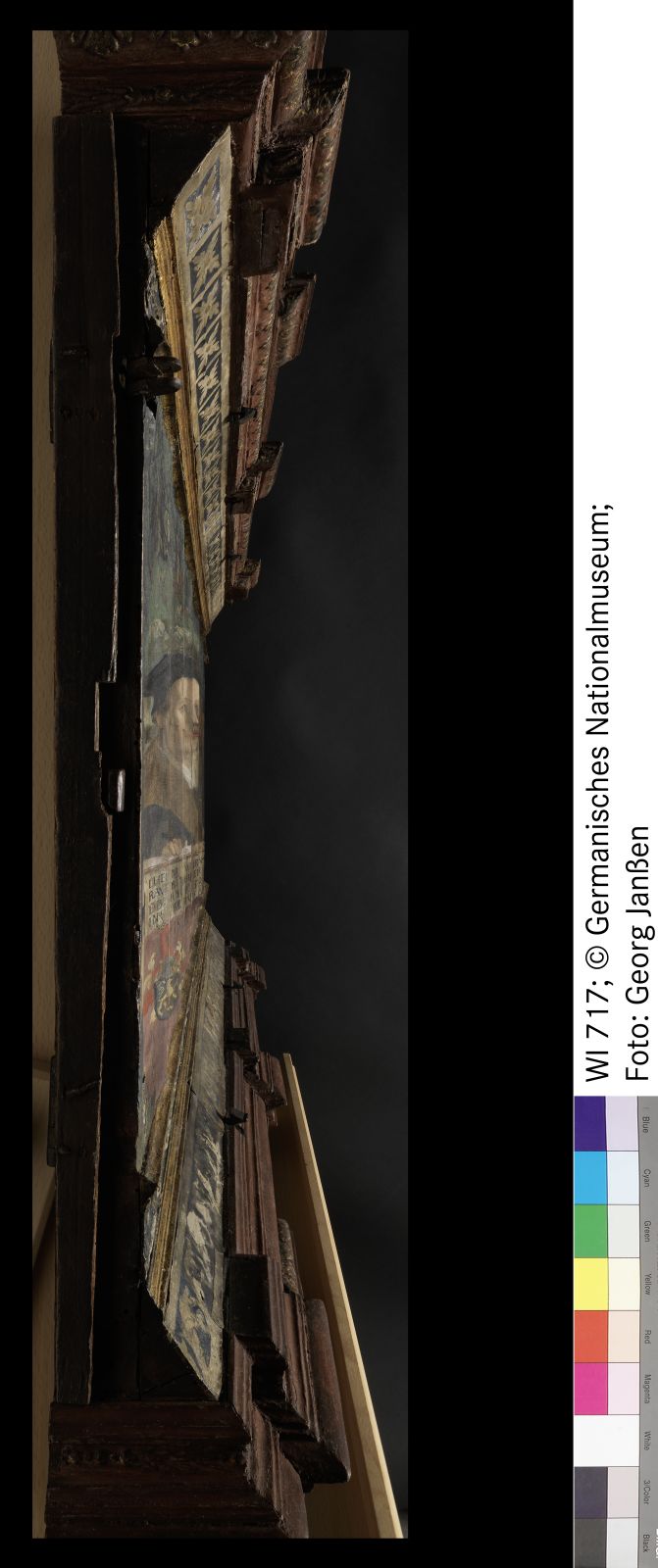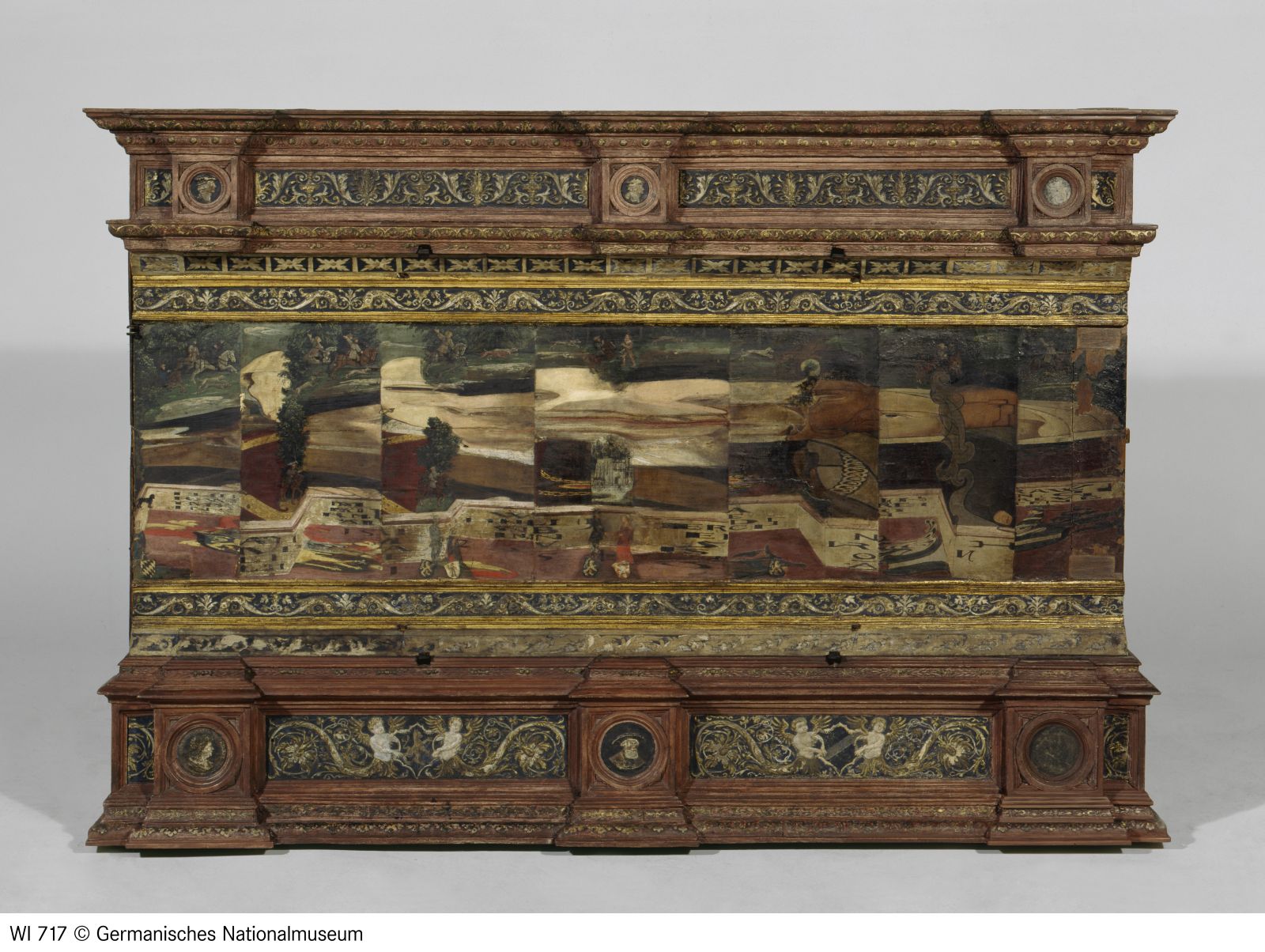 Tafelmalerei auf tlw. leinwandbeklebtem Holzträger; Rahmen: verschiedene Hölzer; Auflagen und Einlagen: Papier und Pappmaché