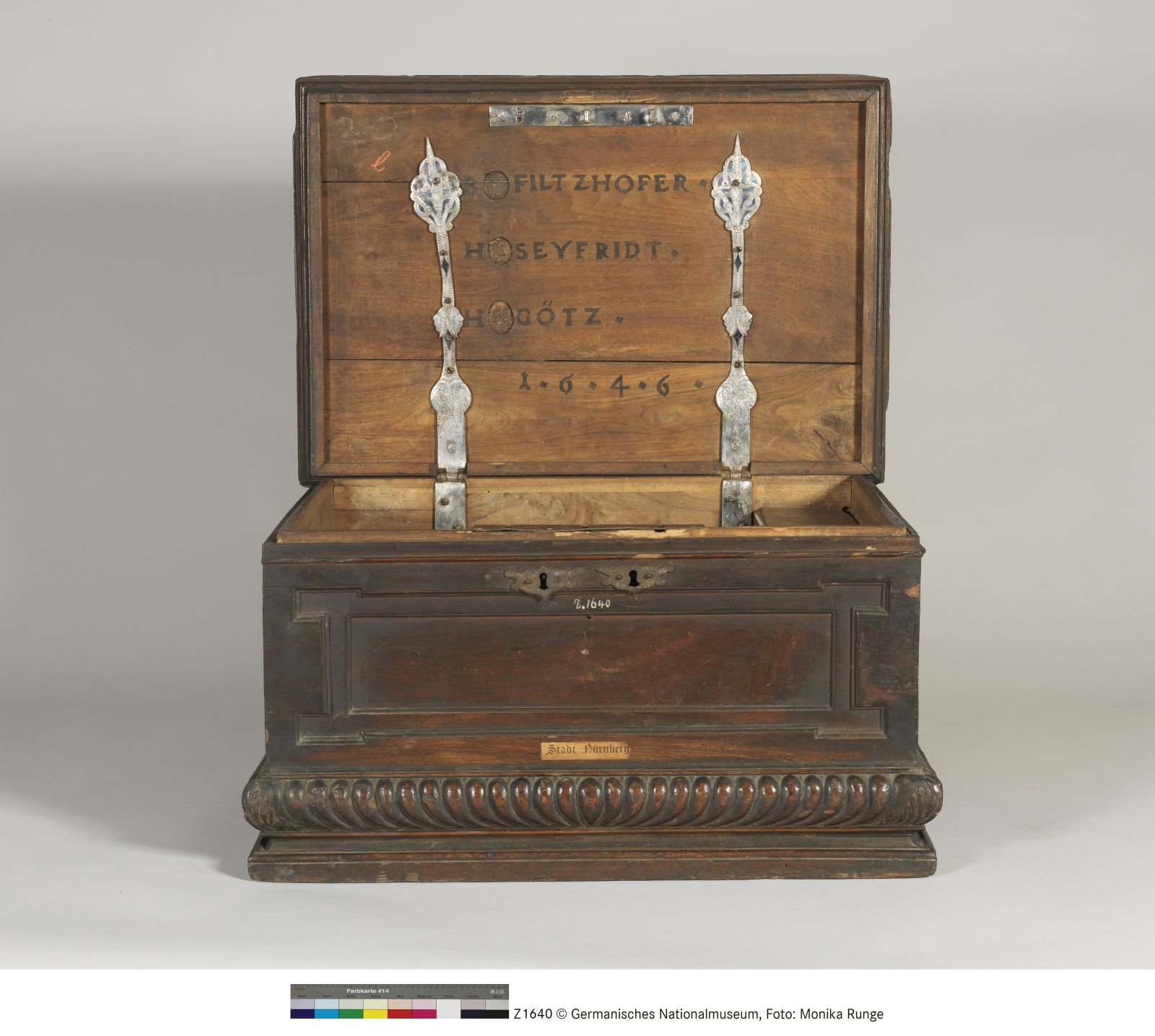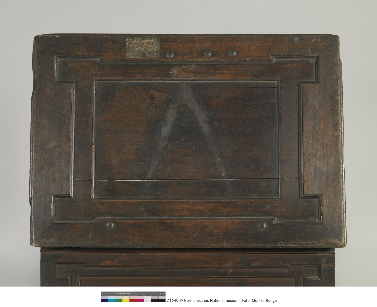 Nussbaum, gesägt, gehobelt, geschnitzt, intarsiert; Eisen geschmiedet, montiert, partiell gebläut, graviert