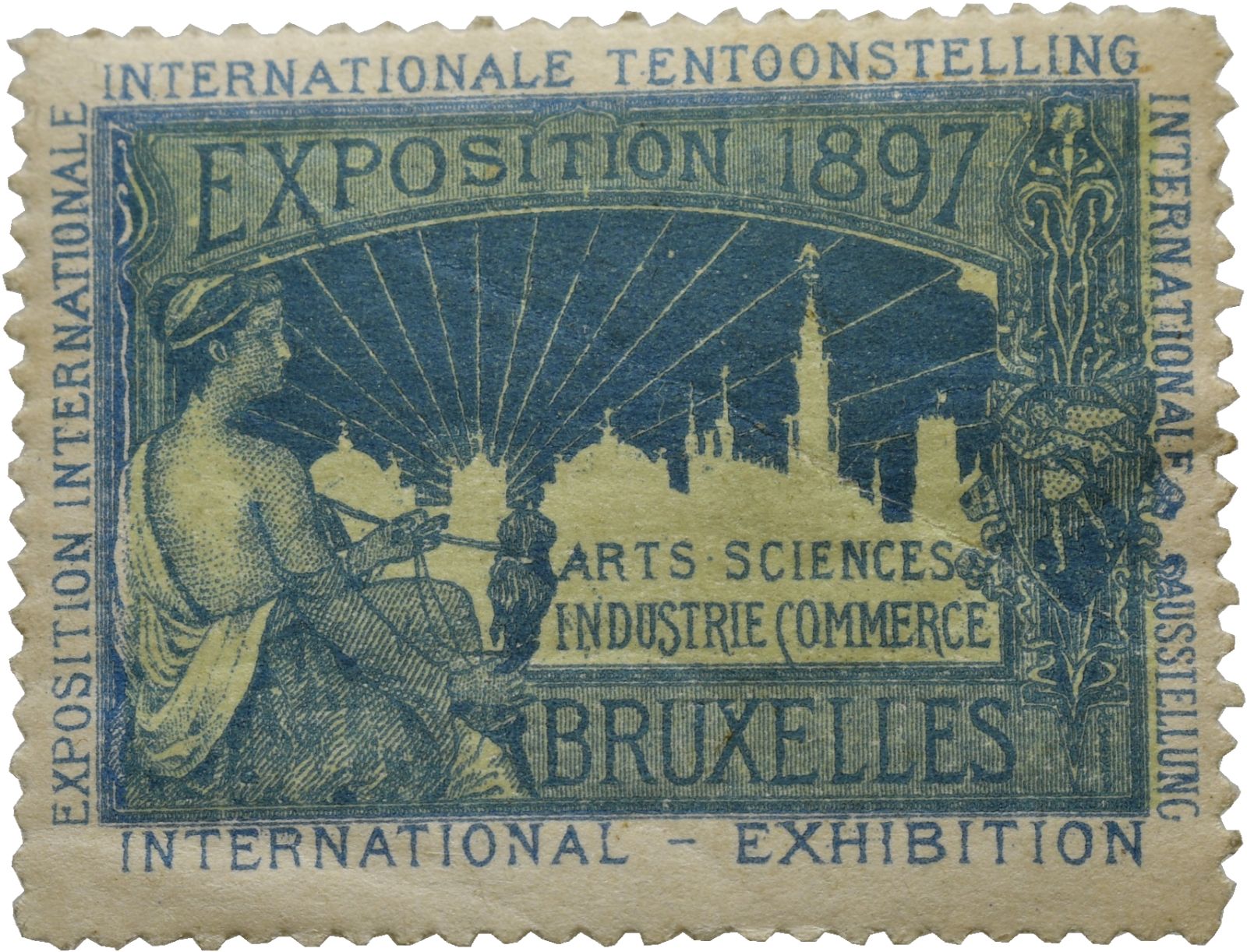 Brüssel, Weltausstellung, Werbemarke, sitzende Frau, blau 1897