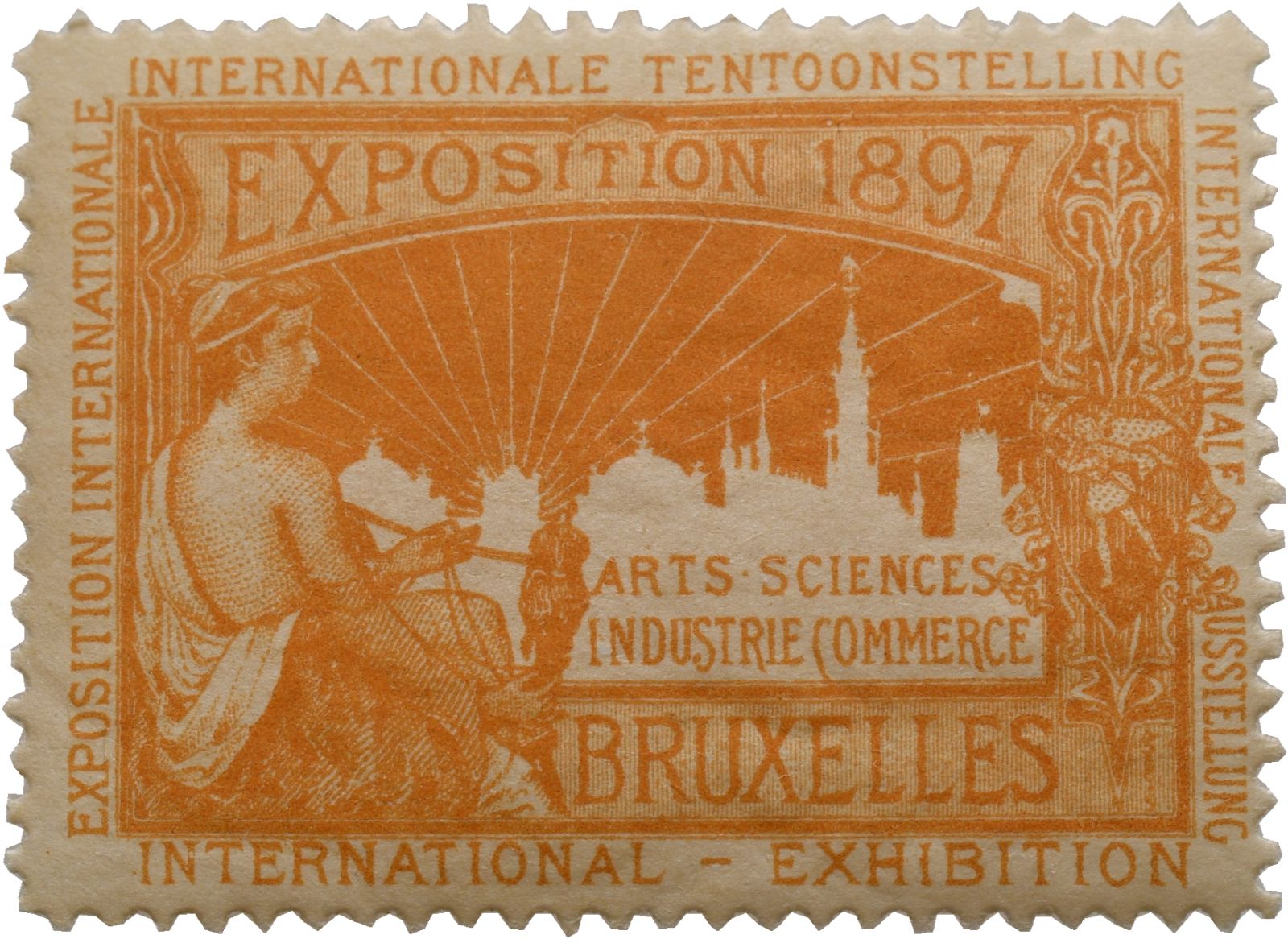 Brüssel, Weltausstellung, Werbemarke, sitzende Frau, orange, 1897