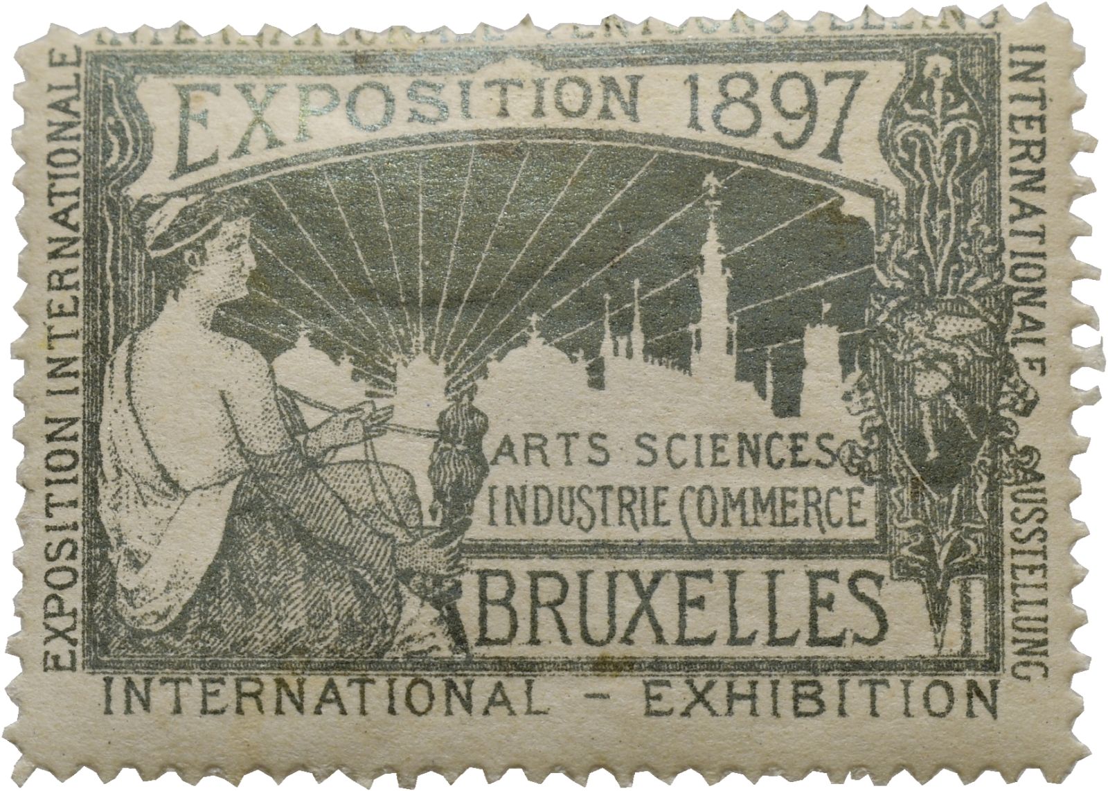 Brüssel, Weltausstellung, Werbemarke, sitzende Frau, grün metallglanz, 1897