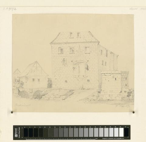 Burg Schönrain, Lkr. Main-Spessart, Bayern: Ansicht des Treppenturmes des Renaissancebaues, Detailansichten, Grundriß, (SP9811_c)